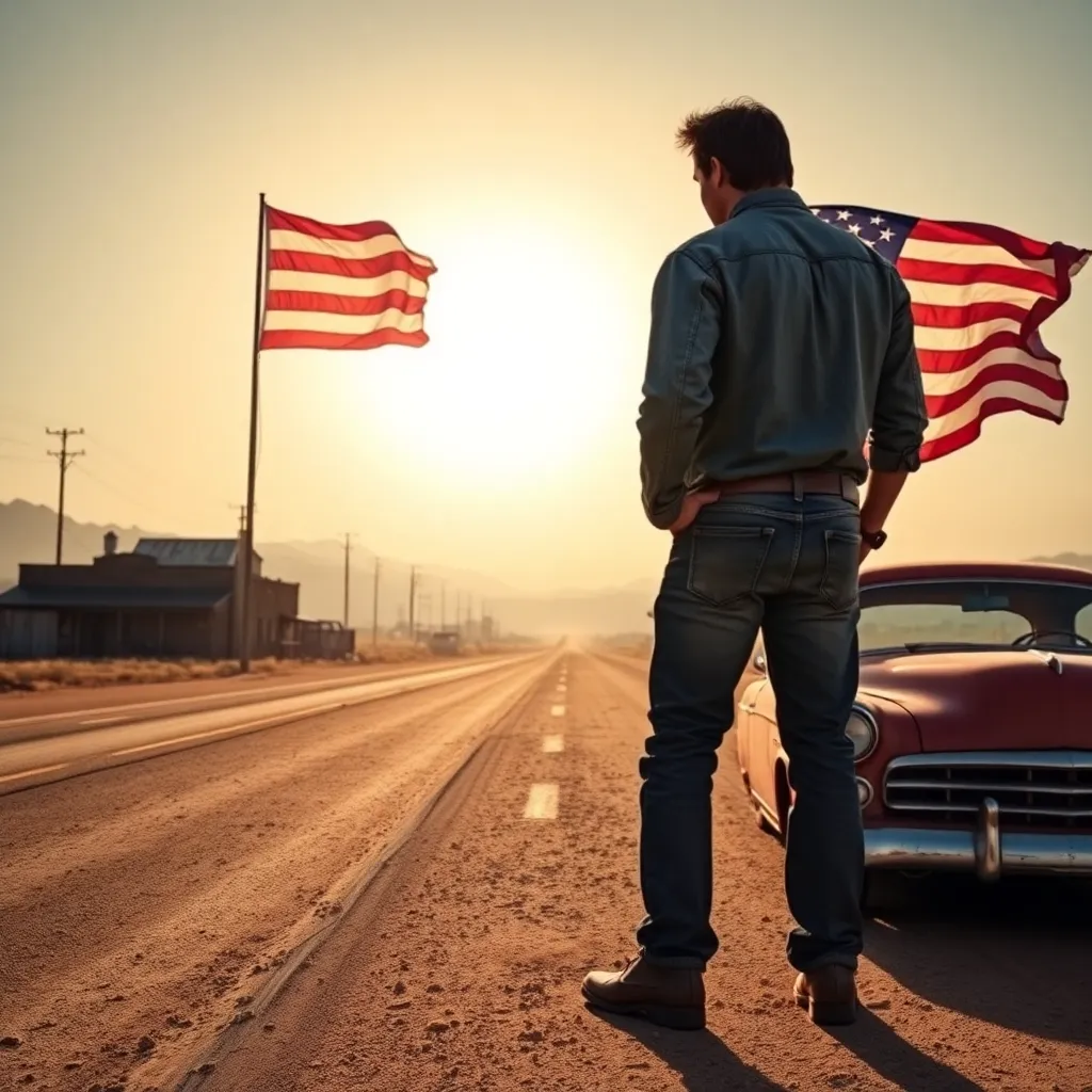 Capture the essence of Bruce Springsteen's iconic song 'Born in the USA' with a gritty, nostalgic image. Depict a worn denim-clad figure standing on a dusty, sun-scorched highway, with a faded American flag fluttering in the background. Incorporate rusty cars, abandoned buildings, and a sense of longing in the atmosphere.