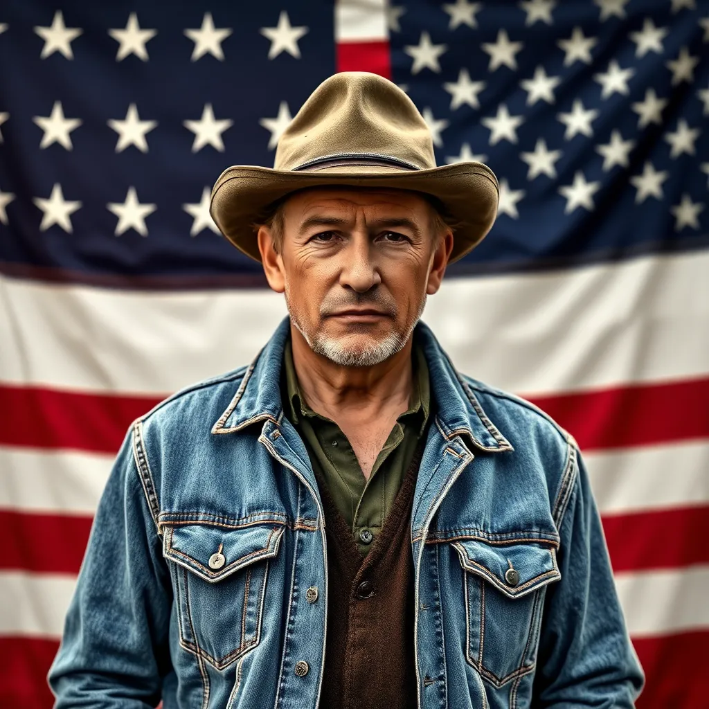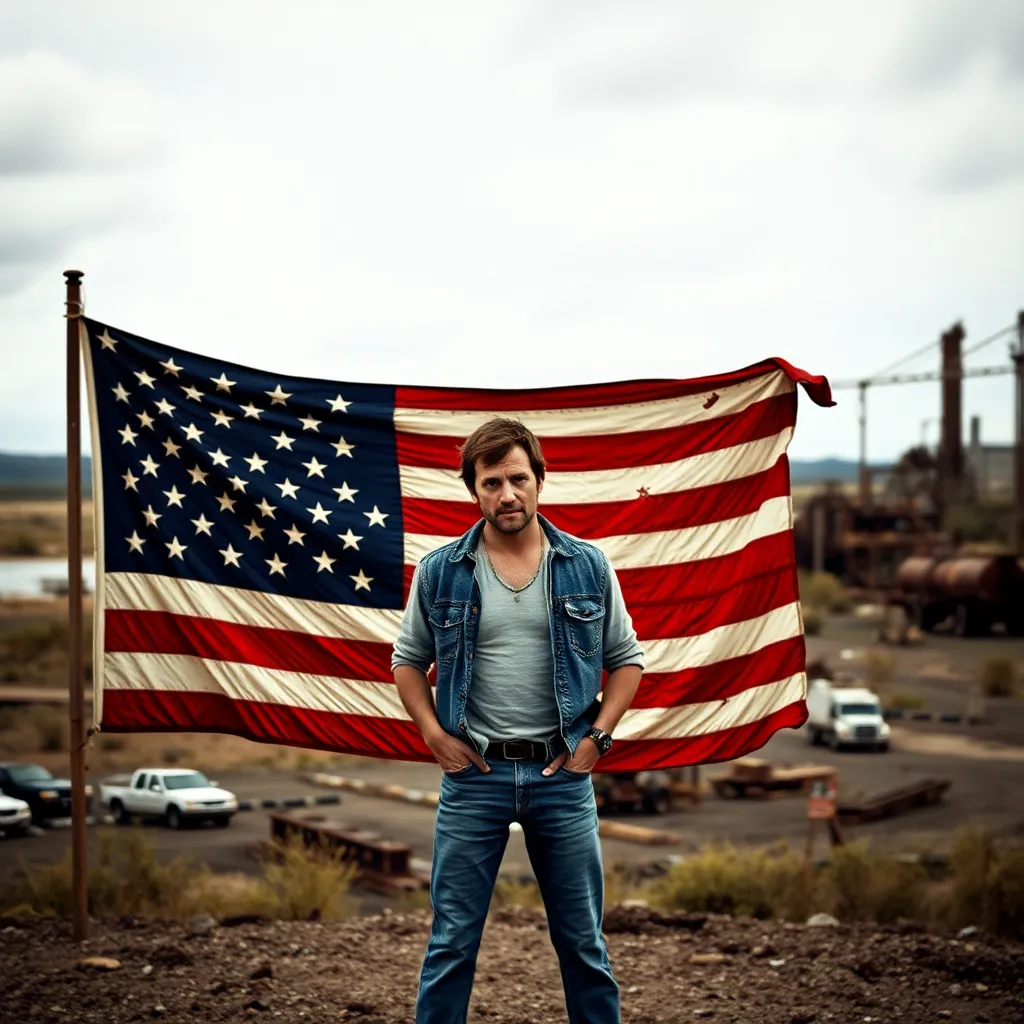 Capture the essence of Bruce Springsteen's iconic song 'Born in the USA' in a single image. Depict a gritty, nostalgic scene of a young American, perhaps a veteran, standing proudly in front of the American flag, with a faded denim jacket and a worn-out hat, evoking a sense of patriotism and resilience.