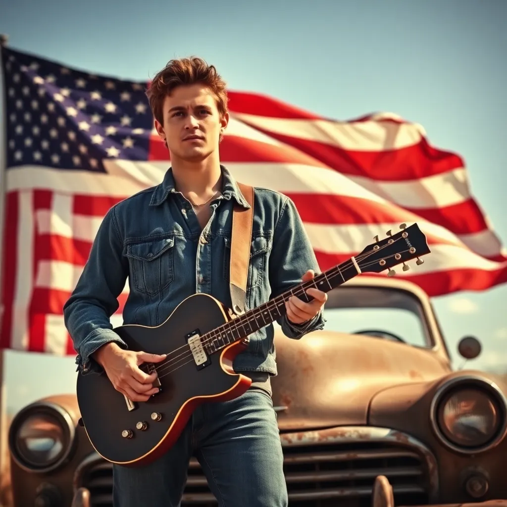 Summer 1984, a sun-kissed American flag waves in the background as a young veteran, dressed in a worn denim jacket and holding a guitar, stands proudly in front of a rusty old car, symbolizing freedom, rebellion, and the struggles of the American Dream. Capture the essence of Bruce Springsteen's iconic song.