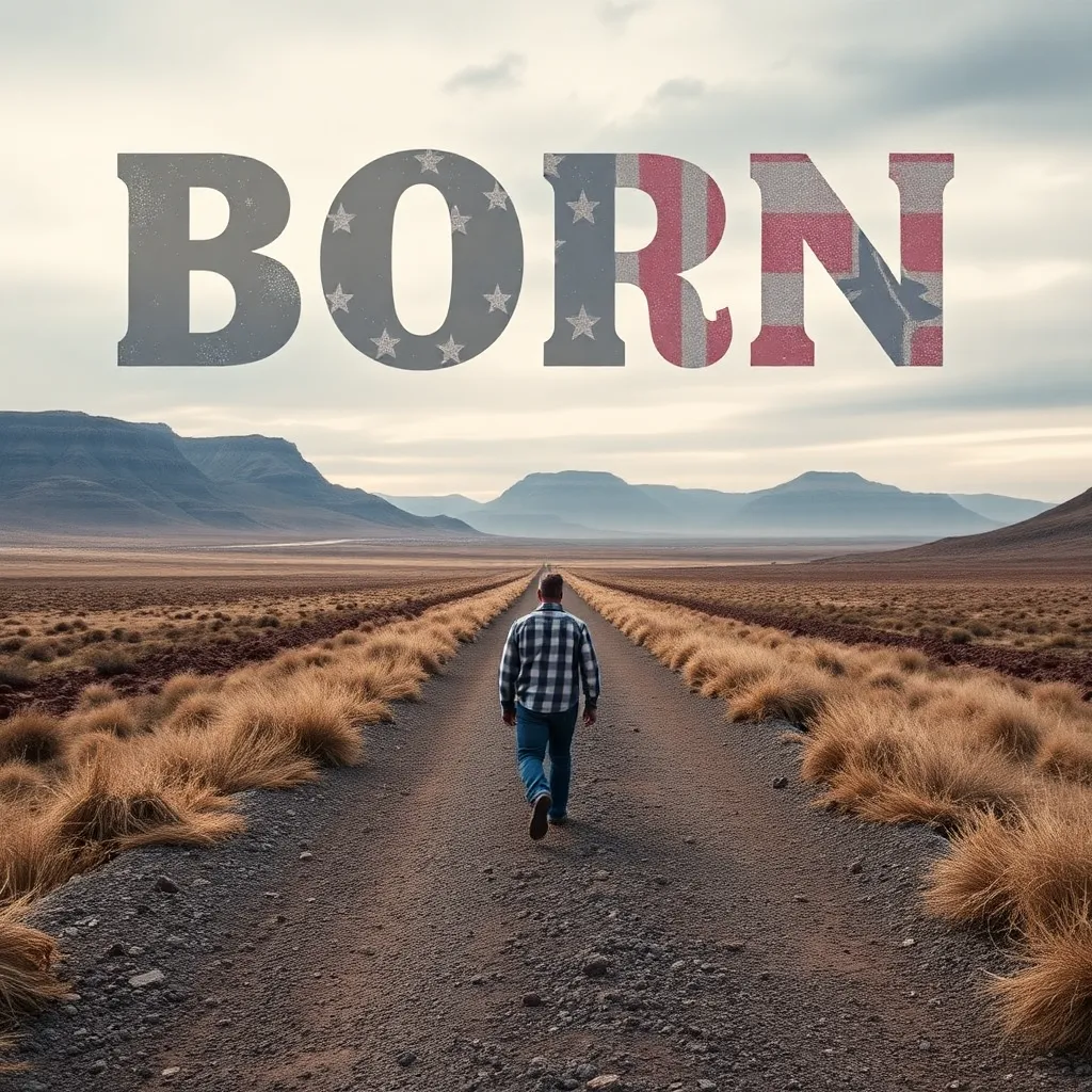 Create an image that captures the essence of Bruce Springsteen's iconic song 'Born in the USA'. Depict a rugged, windswept landscape with a lone figure walking away from the camera, symbolizing the struggles and triumphs of the American working class. Incorporate elements of patriotism, nostalgia, and hope.