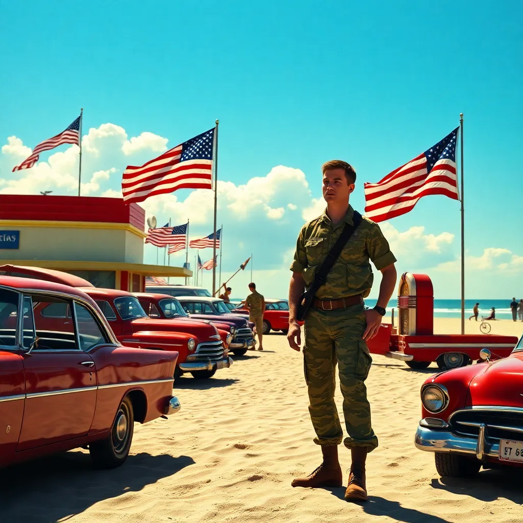 Create an image that captures the essence of Bruce Springsteen's iconic song 'Born in the U.S.A.' - a nostalgic portrayal of a 1980s American summer, with a young soldier returning home from Vietnam, standing proudly on a sun-kissed beach, surrounded by vintage cars, flags, and the distant hum of a jukebox.