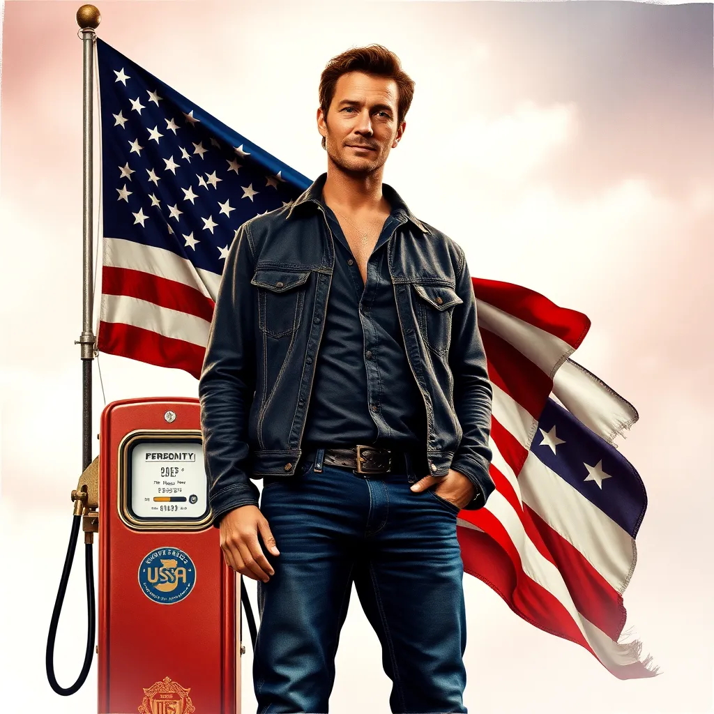 Capture the essence of Bruce Springsteen's iconic album 'Born in the USA' by generating an image that embodies the spirit of American patriotism, freedom, and rebellion. Incorporate elements such as the American flag, a retro-style gas pump, and a young man in denim and leather, symbolizing the struggles and triumphs of the working-class American dream.