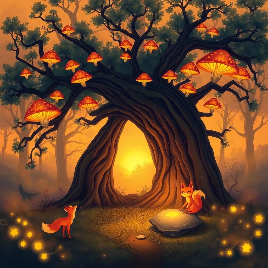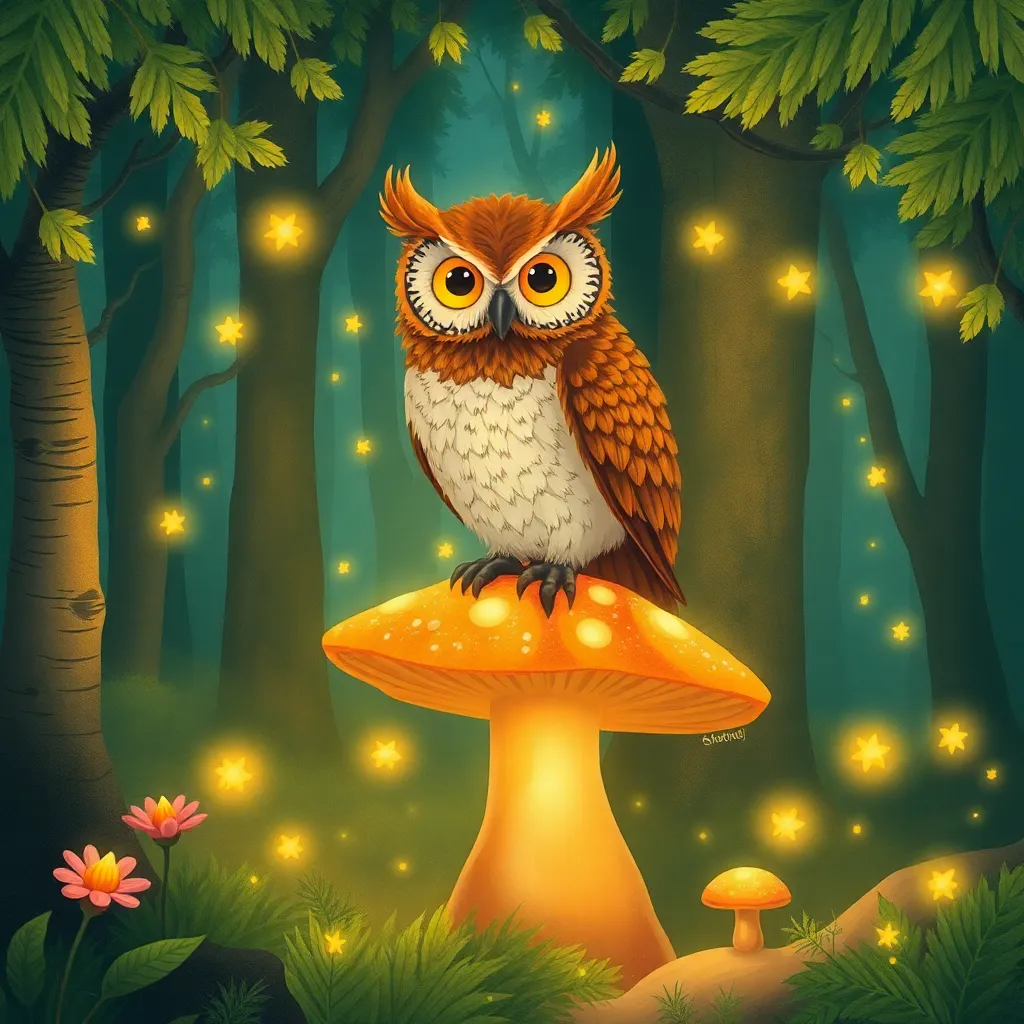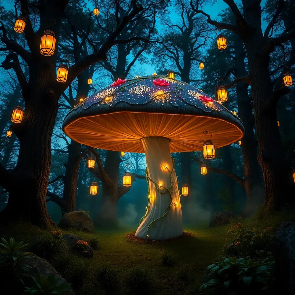 Envision a whimsical forest glade at dusk, with a giant mushroom as a centerpiece. The mushroom is adorned with glowing fireflies and vines, surrounded by towering trees with lanterns aglow. A faint mist rises from the forest floor, adding to the mystical ambiance. Create an image that captures this enchanting scene.