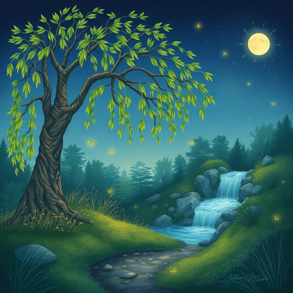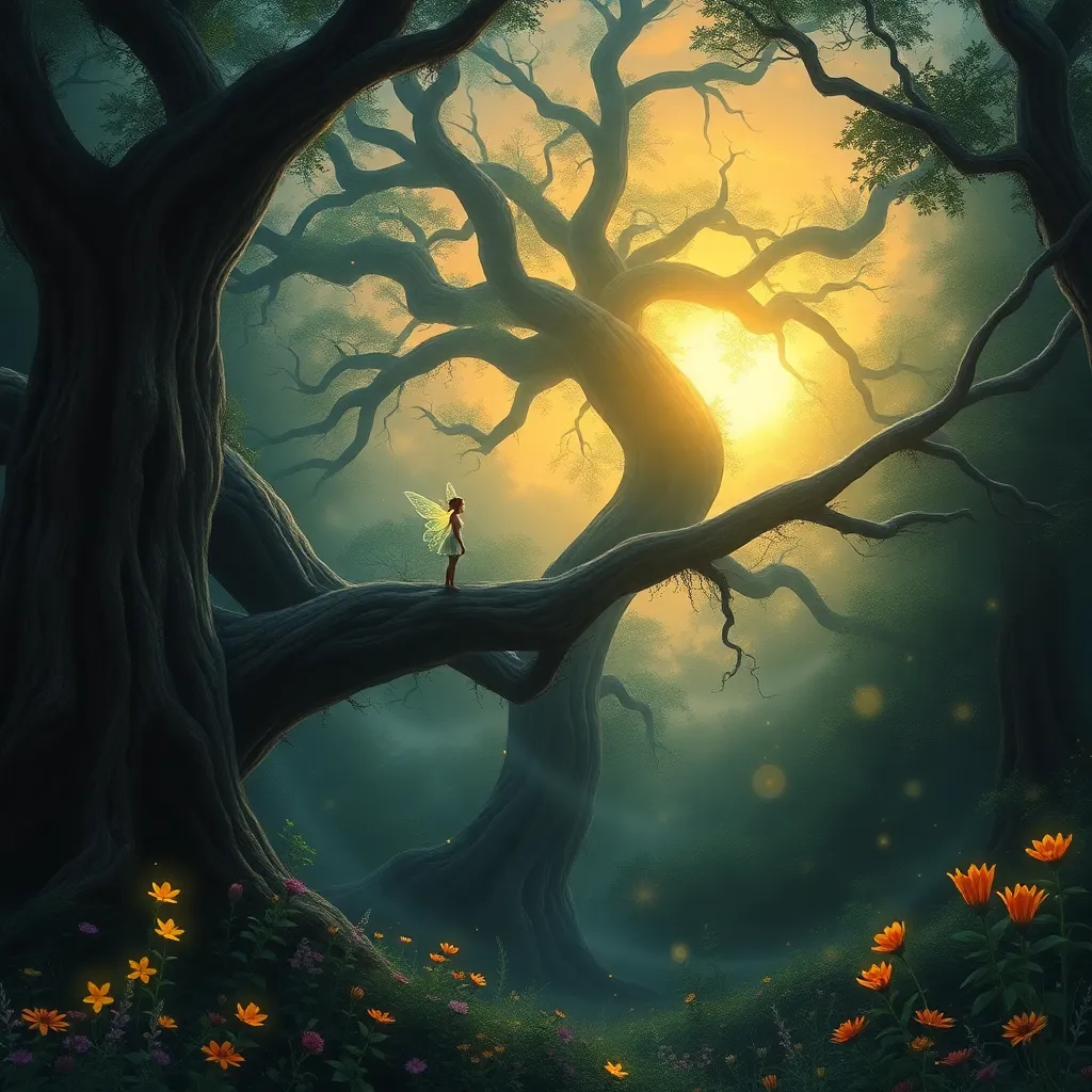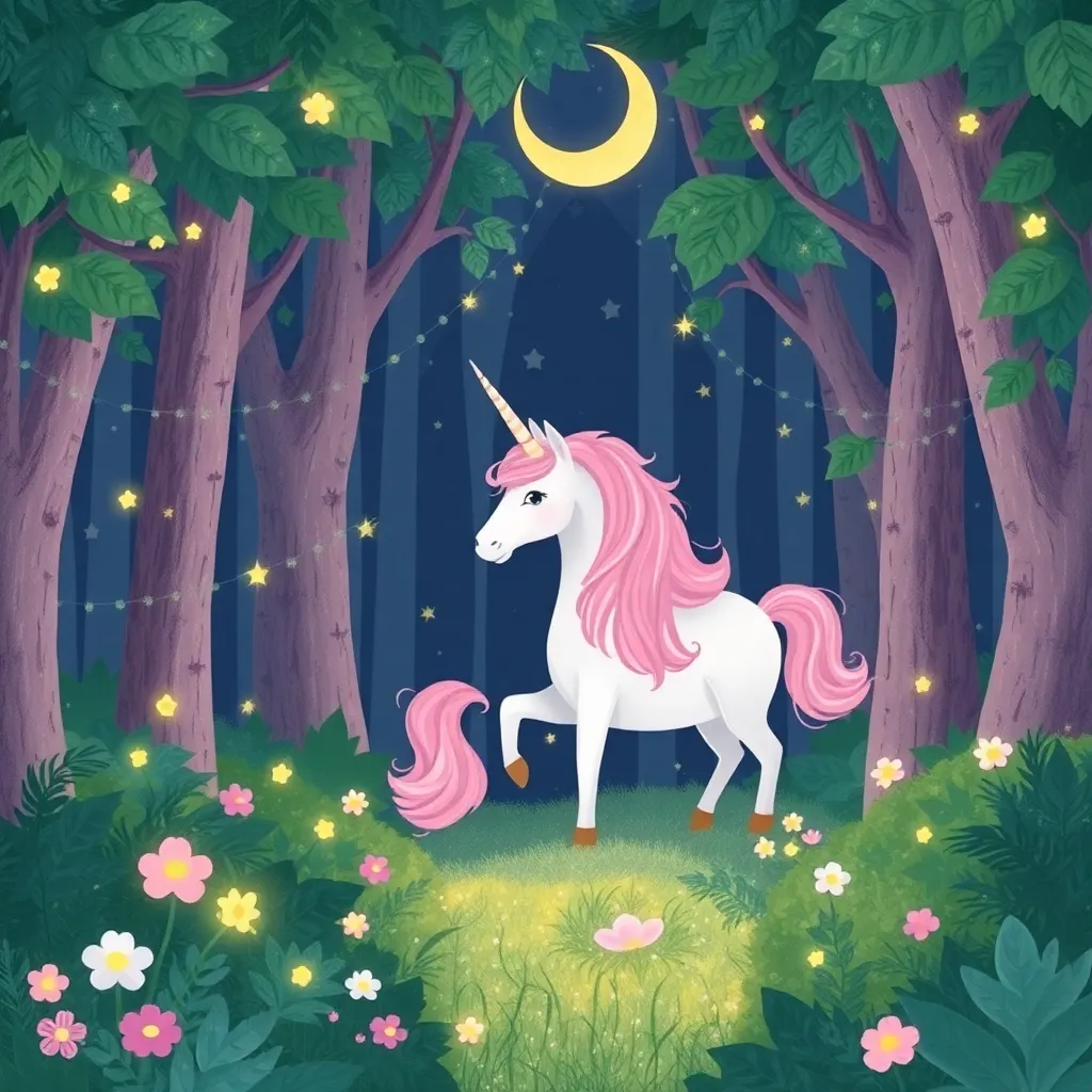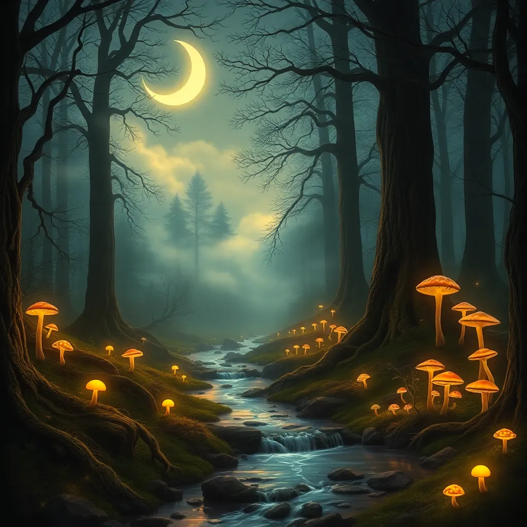 Envision a whimsical forest glade at dusk, with a giant mushroom as a centerpiece. The mushroom is adorned with glowing fireflies and vines, surrounded by towering trees with lanterns aglow. A faint mist rises from the forest floor, adding to the mystical ambiance. Create an image that captures this enchanting scene.