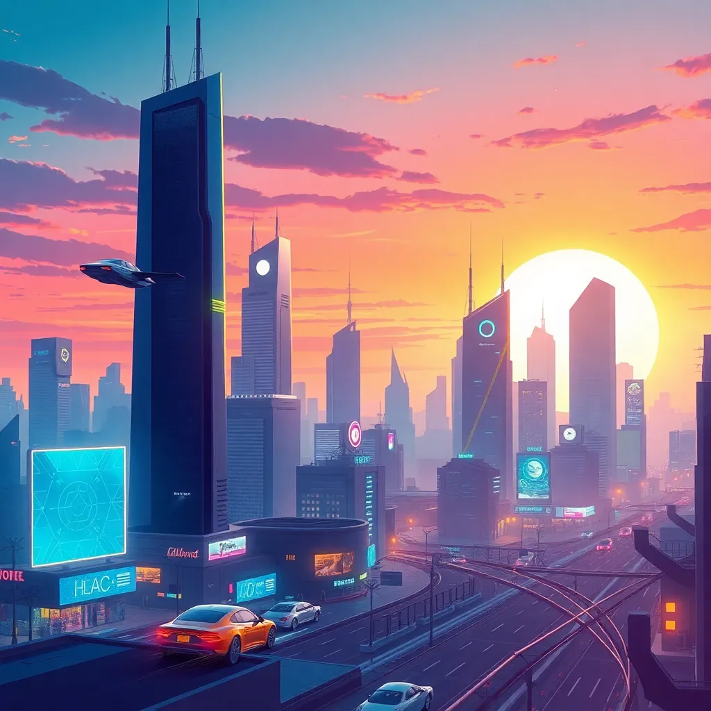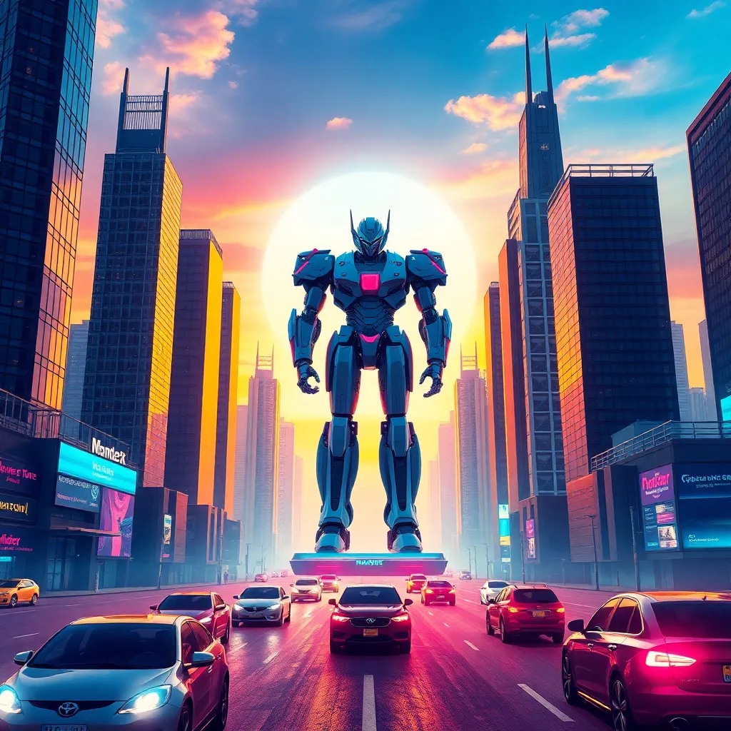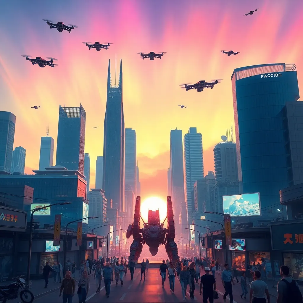 Create a futuristic cityscape at sunset, with sleek skyscrapers, hovering drones, and a vibrant aurora-like glow in the sky. Incorporate a bustling street with humans and robots coexisting, with a giant robot statue in the center. The atmosphere should be dynamic, energetic, and full of technological wonder.