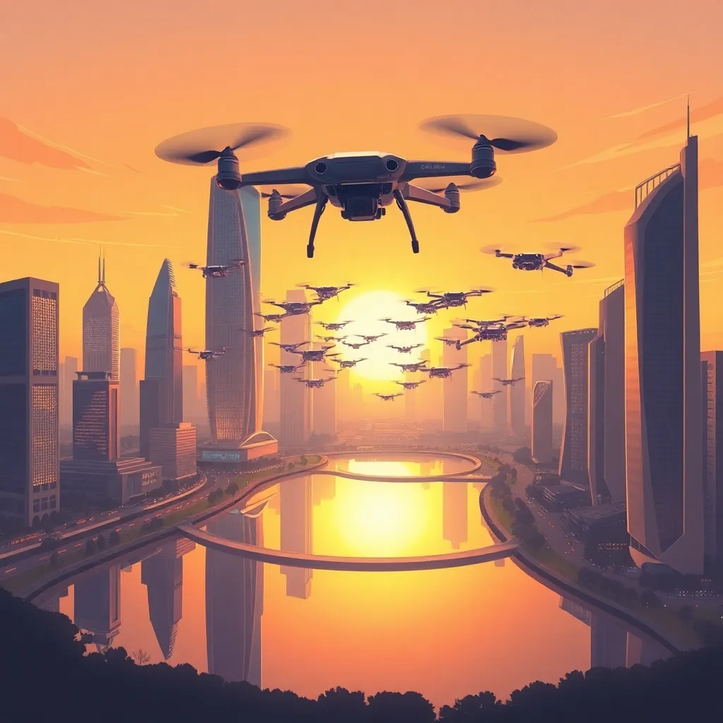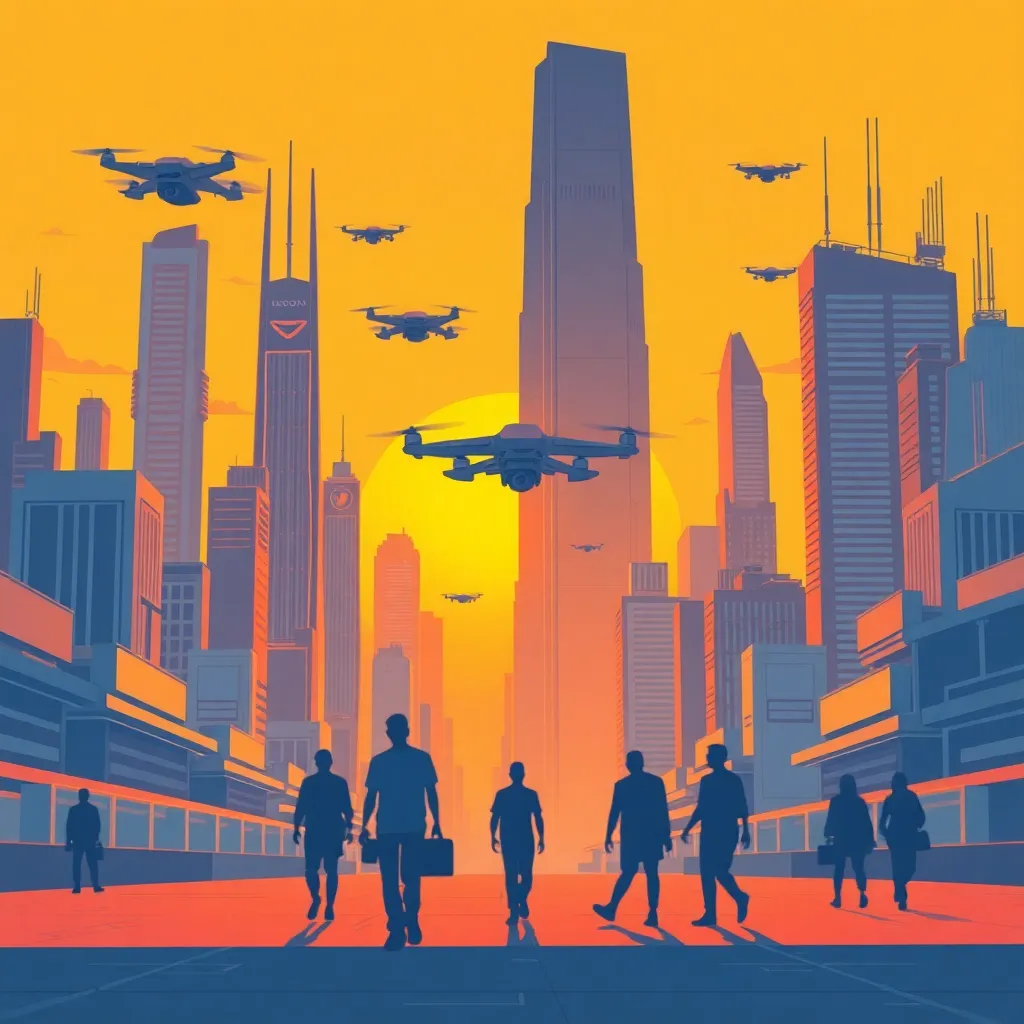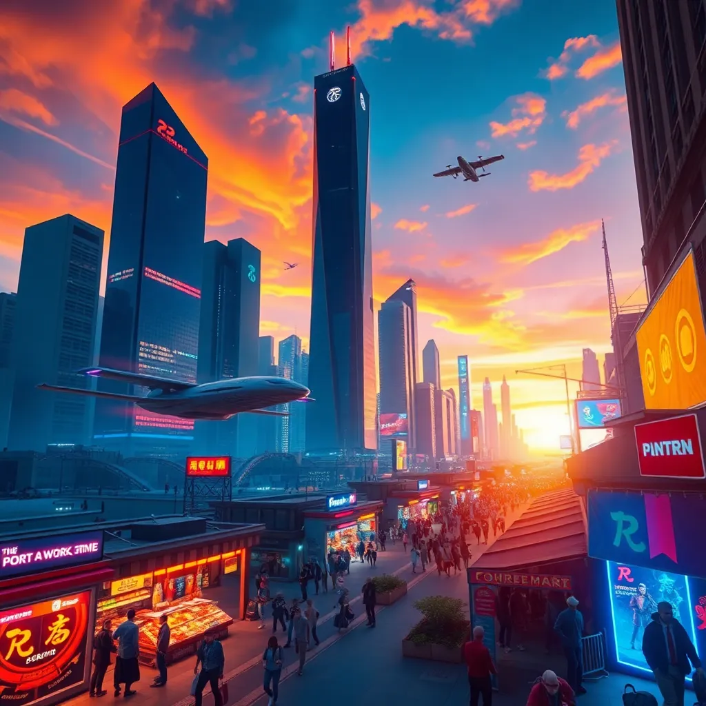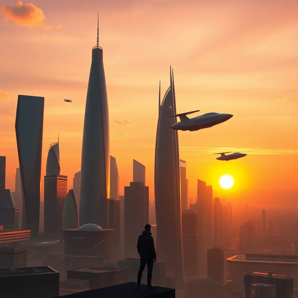 Create a futuristic cityscape at sunset, with sleek skyscrapers, hovering drones, and a vibrant aurora-like glow in the sky. Incorporate a bustling street with humans and robots coexisting, with a giant robot statue in the center. The atmosphere should be dynamic, energetic, and full of technological wonder.