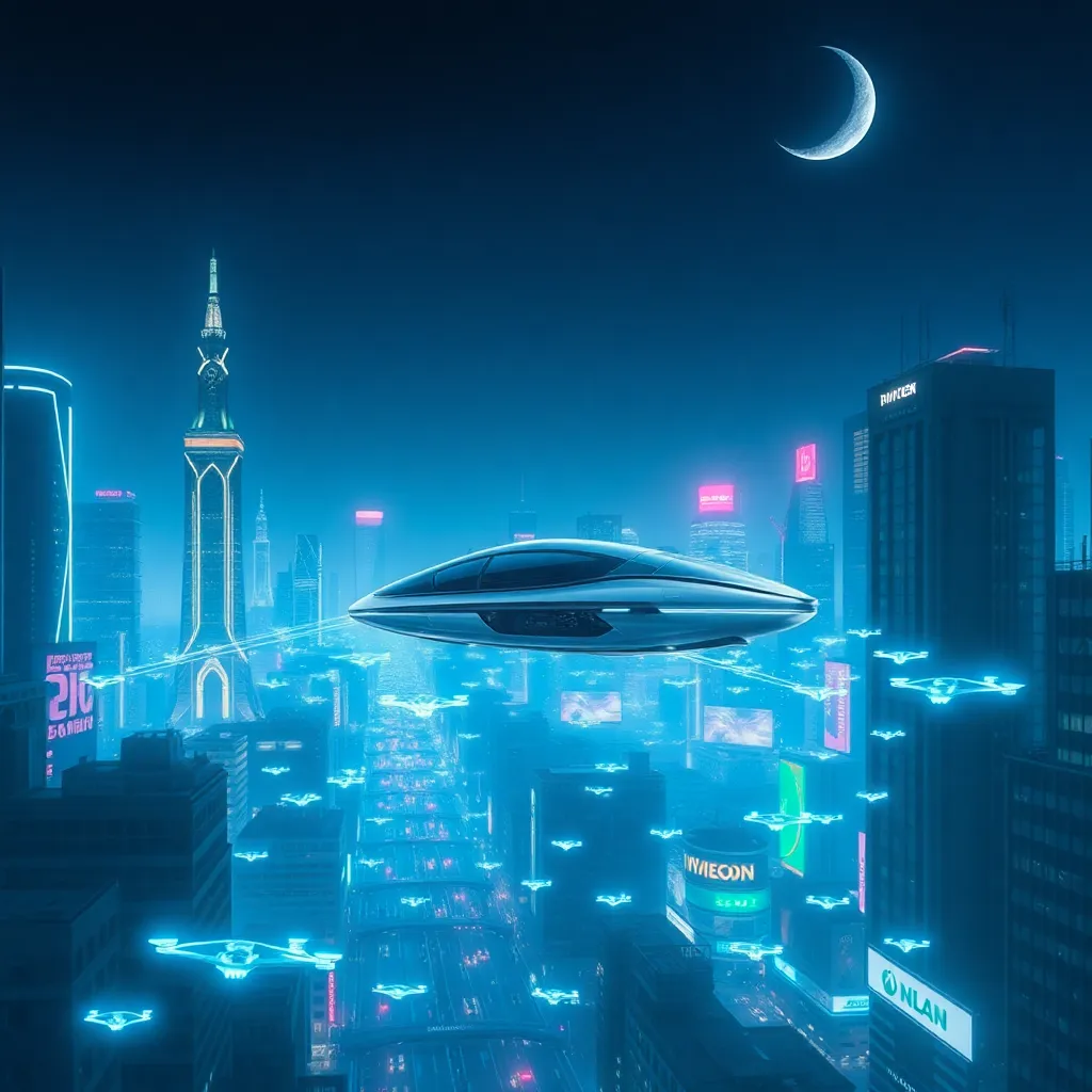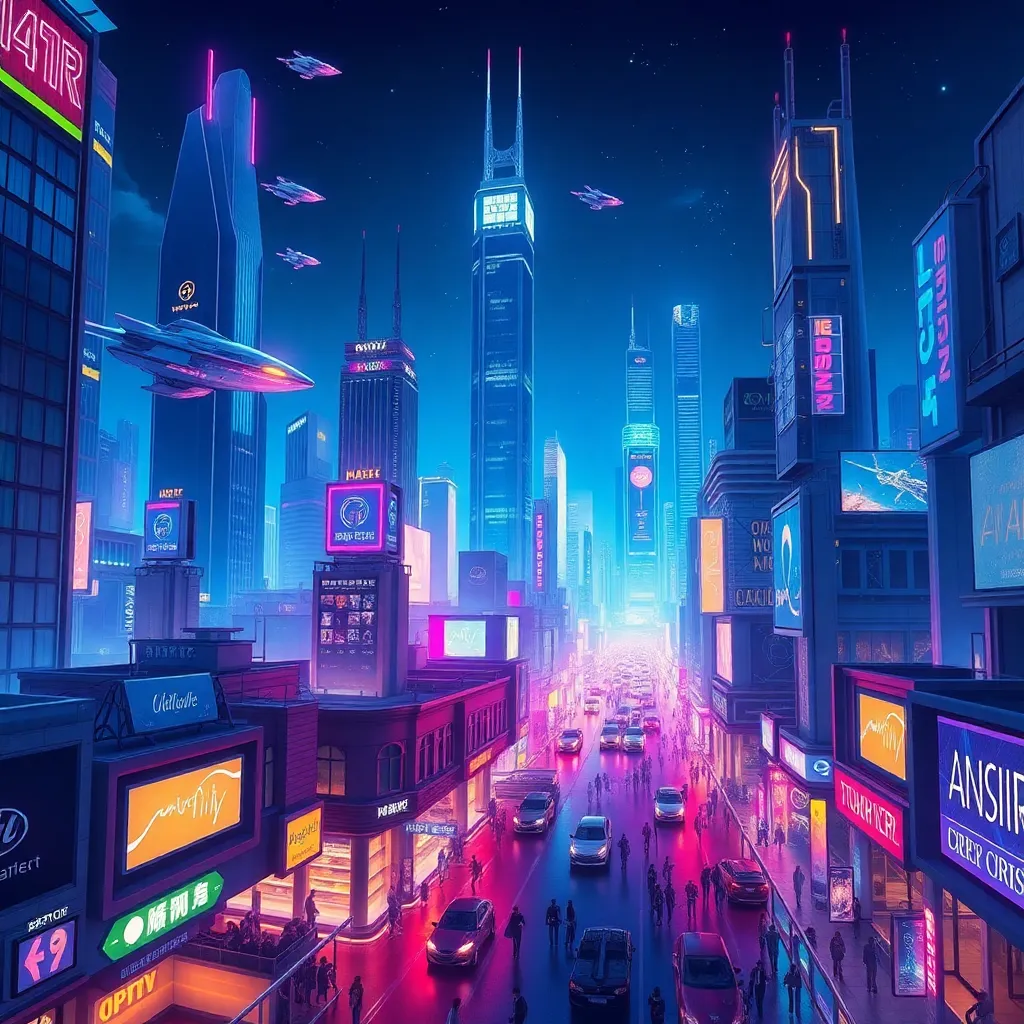 Create a futuristic cityscape with towering skyscrapers, flying cars, and a vibrant nightlife. Incorporate neon lights, holographic advertisements, and a bustling street scene. The dominant colors should be blues and purples, with accents of gold and silver. Add a sense of movement and energy to the scene.