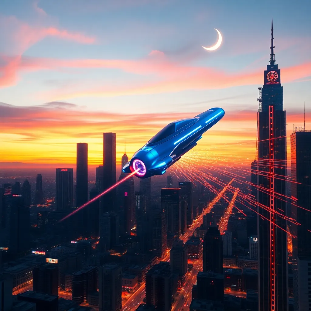 Create a futuristic cityscape at sunset with towering skyscrapers, neon lights, and a sprawling metropolis. Incorporate a sleek, electric blue hoverbike soaring through the air, leaving a trail of sparks. The sky should be ablaze with hues of orange, pink, and purple, with a crescent moon glowing softly.