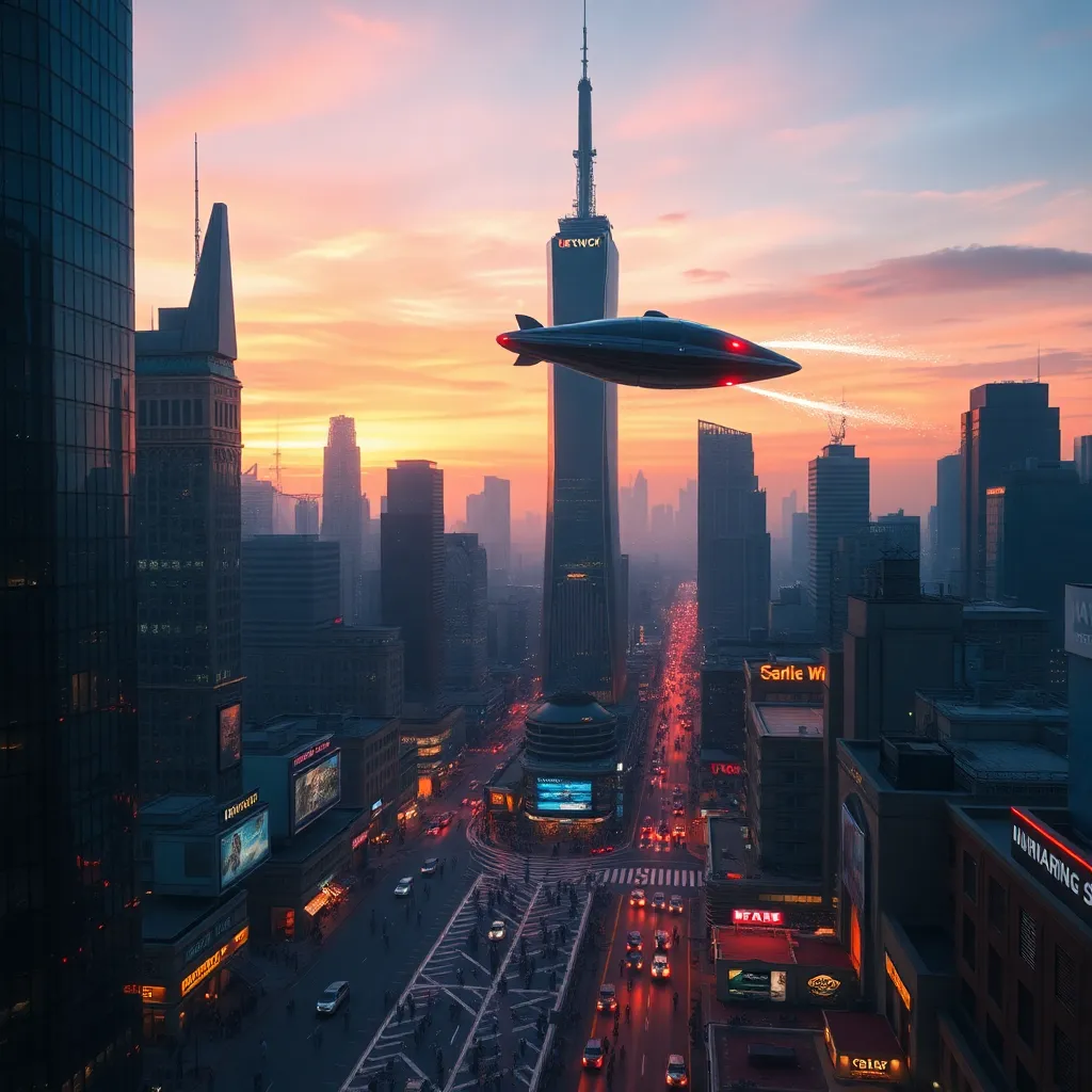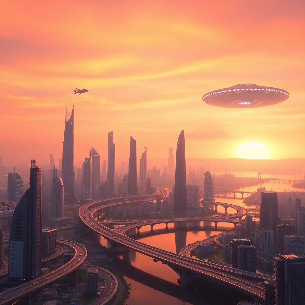 Create a futuristic cityscape at sunset, with sleek skyscrapers and holographic advertisements illuminating the darkening sky. Incorporate a majestic spaceship landing in the distance, with a trail of sparks and smoke behind it. The city streets are bustling with humans and robots, showcasing a harmonious blend of technology and nature.