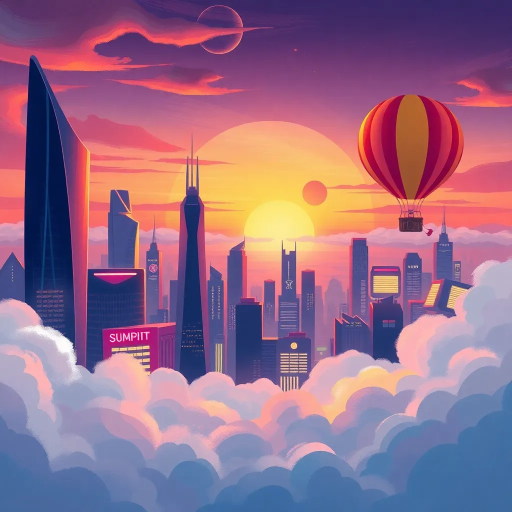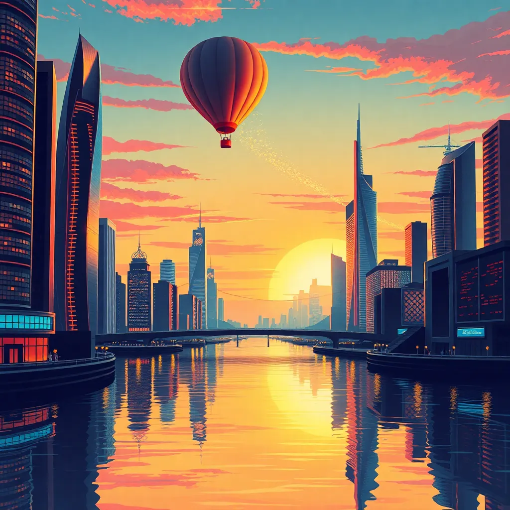 Create an illustration of a futuristic cityscape at sunset, with sleek skyscrapers and neon lights reflecting off the water. Incorporate a hot air balloon soaring above the city, leaving a trail of glittering sparks behind it. The scene should be vibrant and full of energy, with a sense of adventure and possibility.