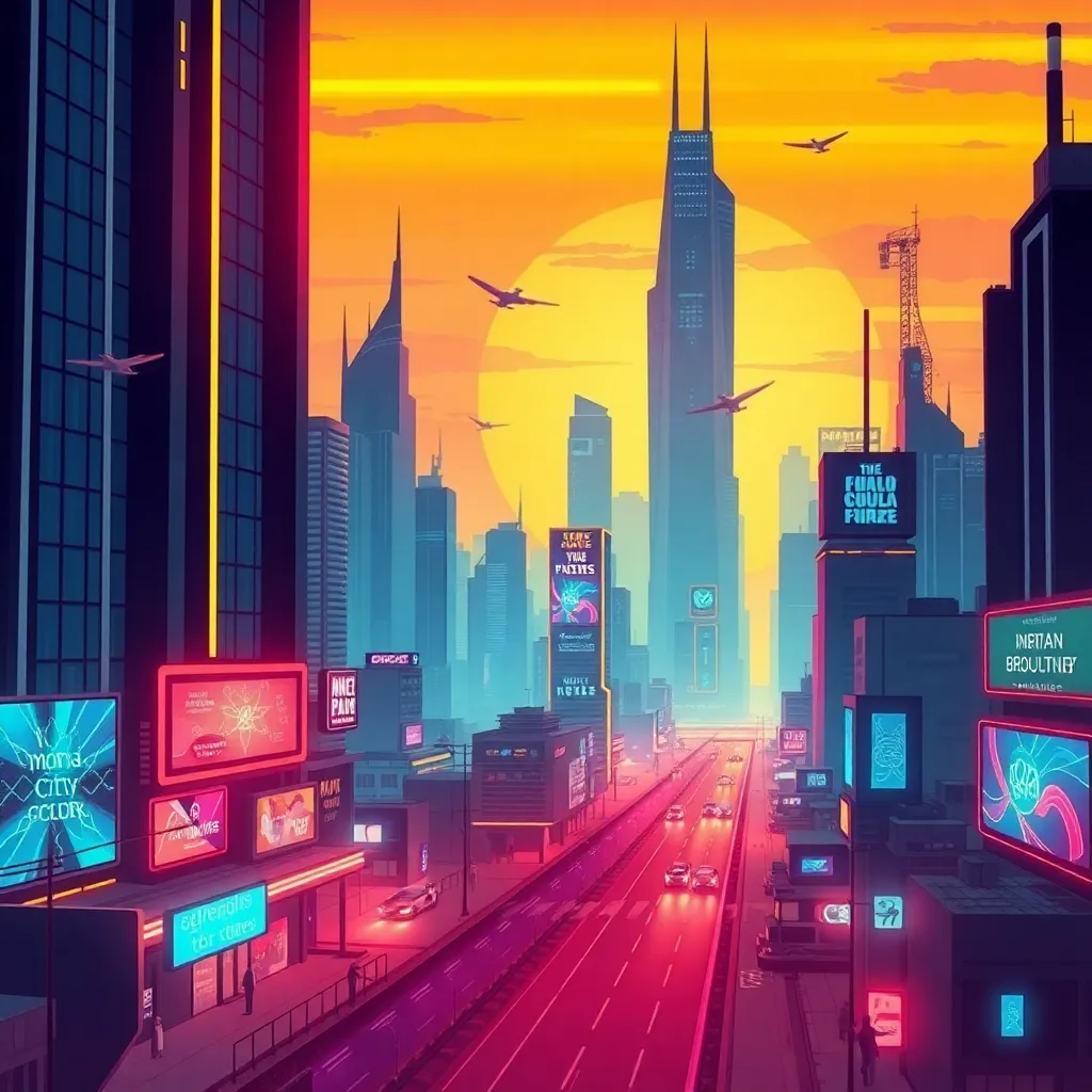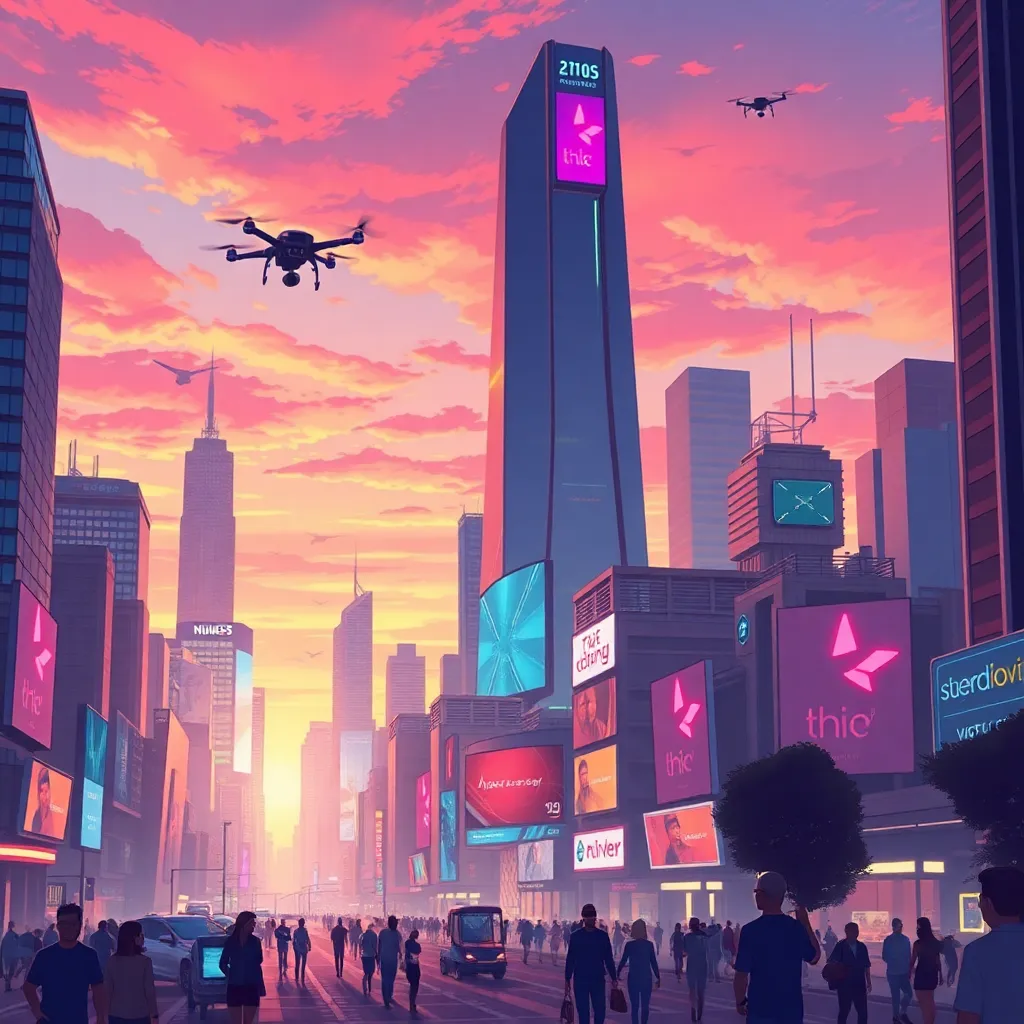 Create an illustration of a futuristic cityscape at sunset, with sleek skyscrapers, hovering drones, and a vibrant atmosphere. Incorporate neon lights, holographic advertisements, and a stunning sky with hues of pink, orange, and purple. The city should be bustling with activity, with people from all walks of life going about their day.
