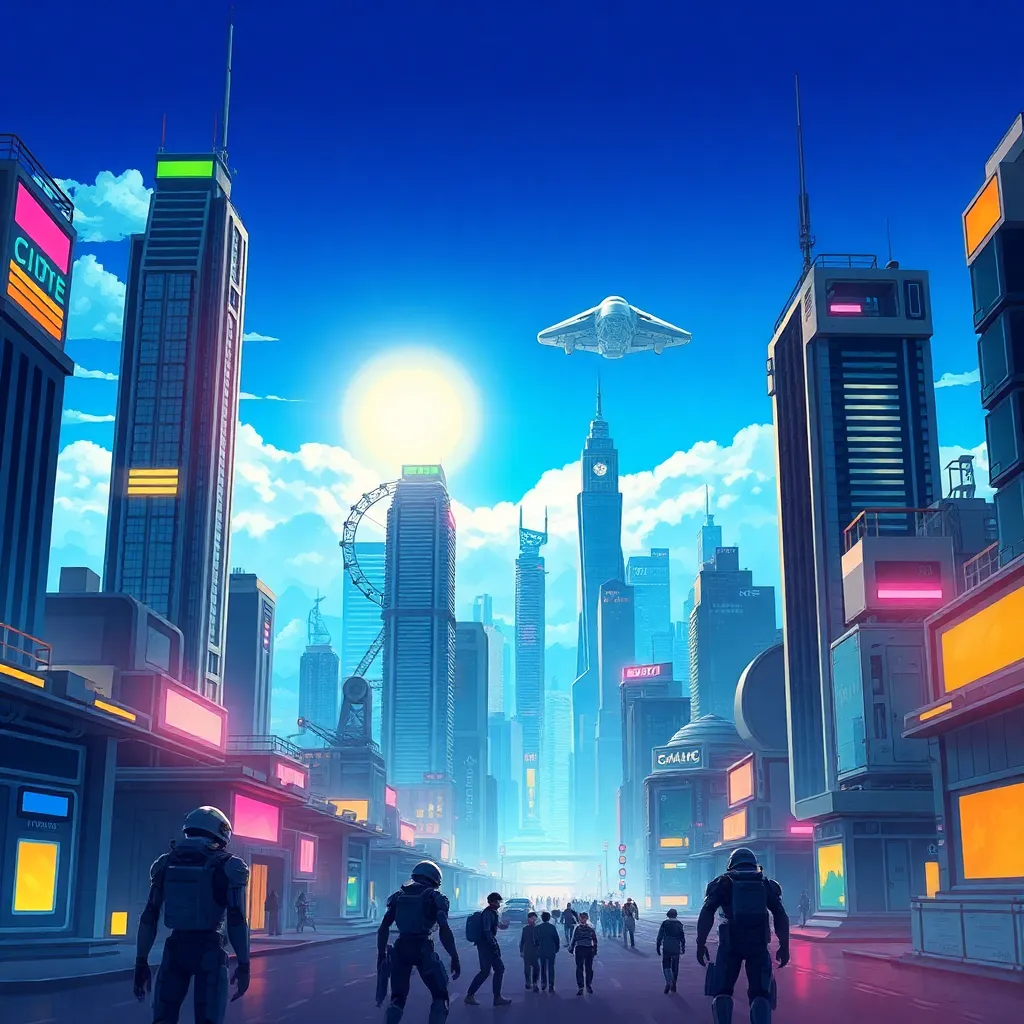 Create an illustration of a futuristic cityscape with towering skyscrapers, a bright blue sky, and a single, gleaming spaceship landing in the distance. Incorporate vibrant colors, neon lights, and a sense of excitement and possibility. The city should be bustling with activity, with humans and robots coexisting peacefully.