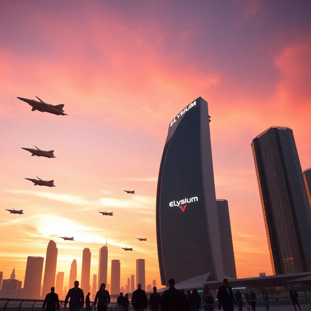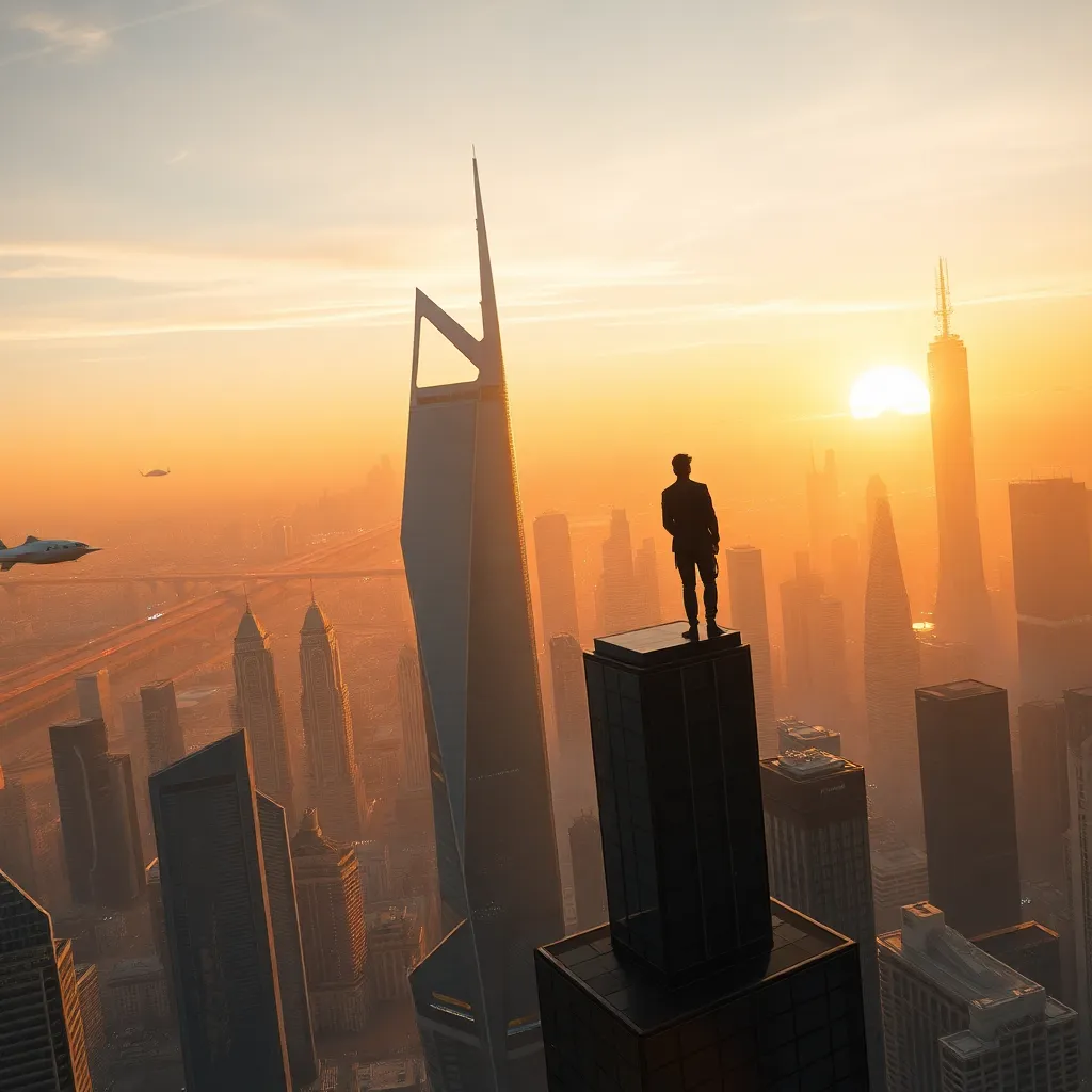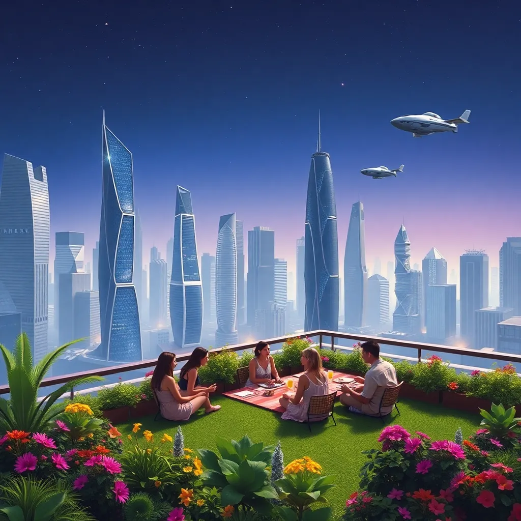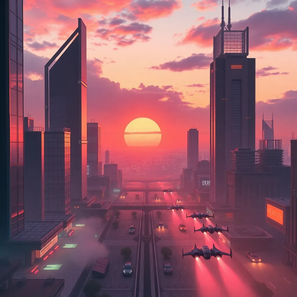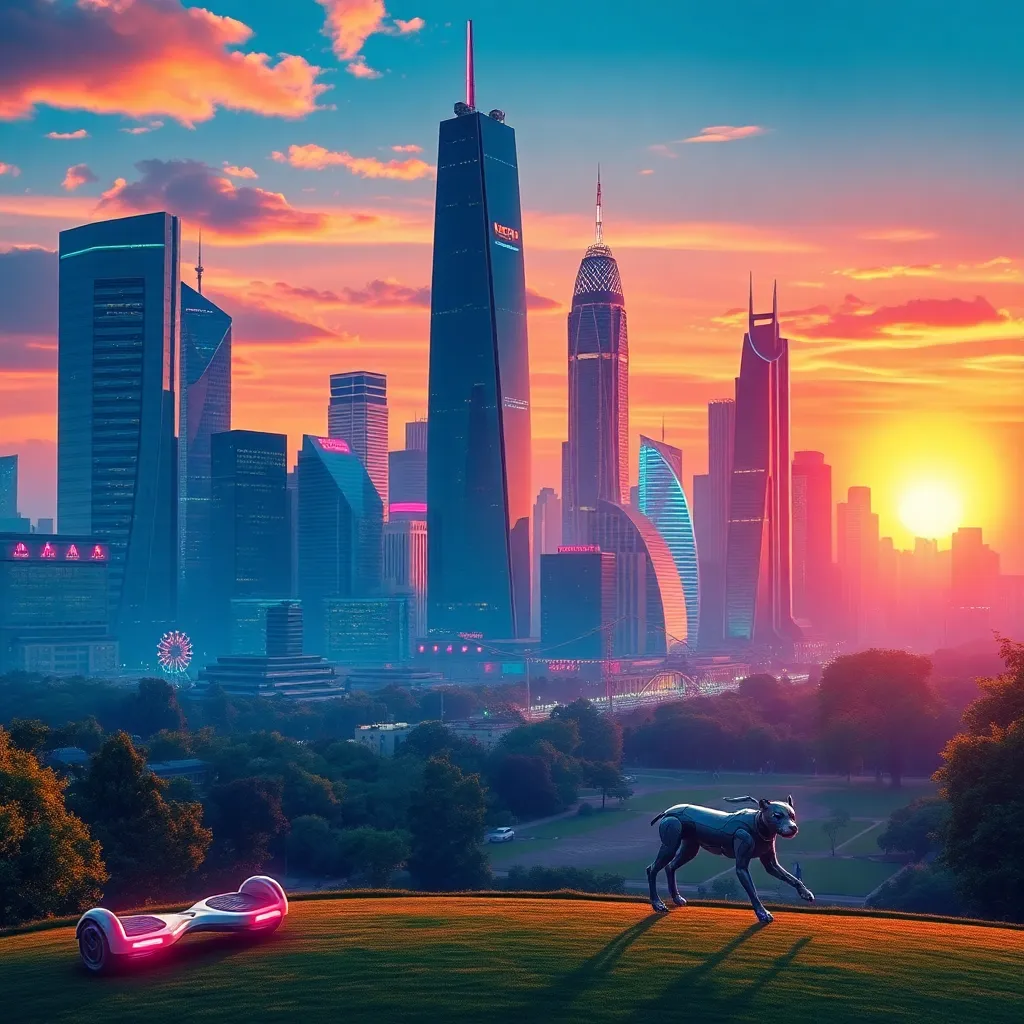 Create an imaginative futuristic cityscape at sunset, with sleek skyscrapers, hovering cars, and a vibrant atmosphere. Incorporate a stunning central park with glowing trees, a shimmering lake, and a futuristic Ferris wheel. The sky should be a warm blend of oranges, pinks, and purples, with a hint of mist.