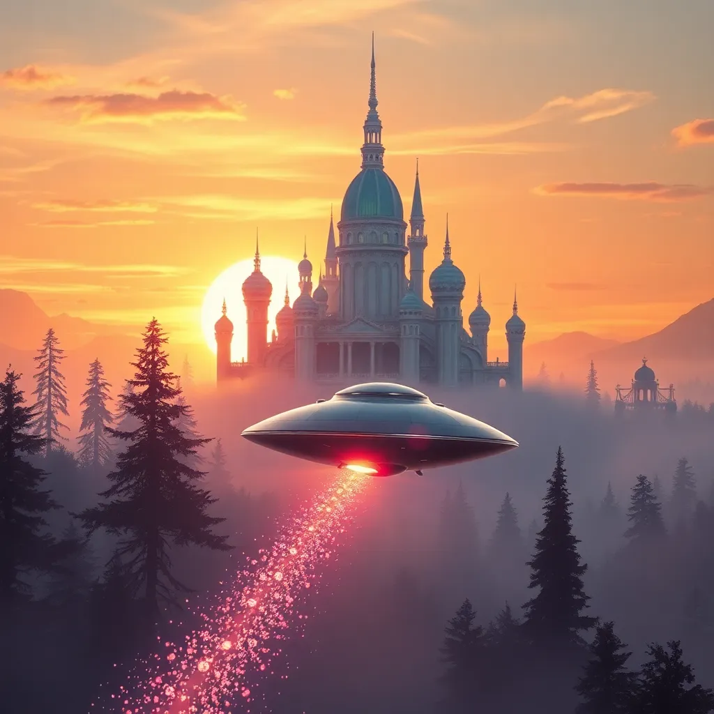Envision a whimsical, futuristic cityscape at sunset. A grand, iridescent palace rises from the misty horizon, surrounded by towering, glowing trees and wispy, starry clouds. In the foreground, a sleek, silver spaceship lands delicately, releasing a trail of shimmering, rainbow-colored sparks into the atmosphere.