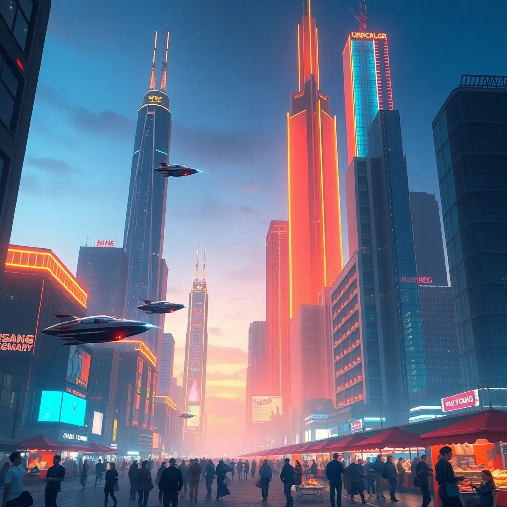 Create an image of a futuristic cityscape at sunset, with sleek skyscrapers, flying cars zipping by, and a vibrant market square filled with colorful street performers and vendors. Incorporate neon lights, holographic advertisements, and a warm orange glow to capture the bustling energy of this futuristic metropolis.