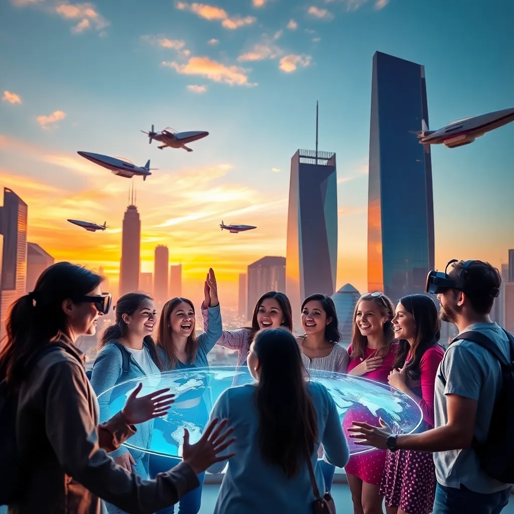 Create an futuristic cityscape at dusk, with sleek skyscrapers, neon lights, and a misty atmosphere. Incorporate a group of people from diverse backgrounds walking together, holding hands, and smiling, symbolizing unity and hope. The sky should be a warm orange-pink hue, with a crescent moon shining bright.