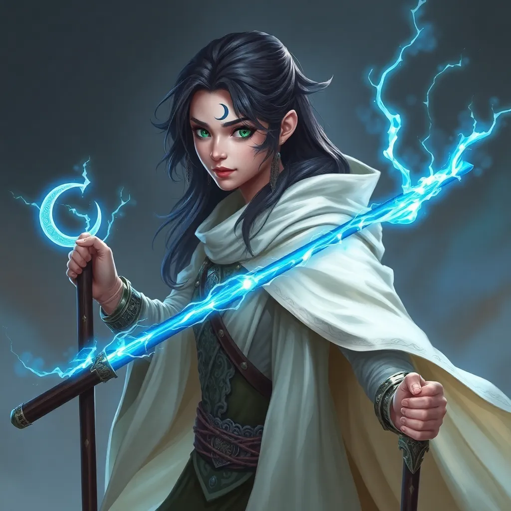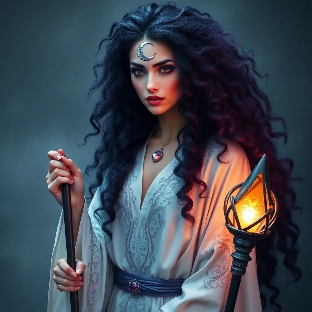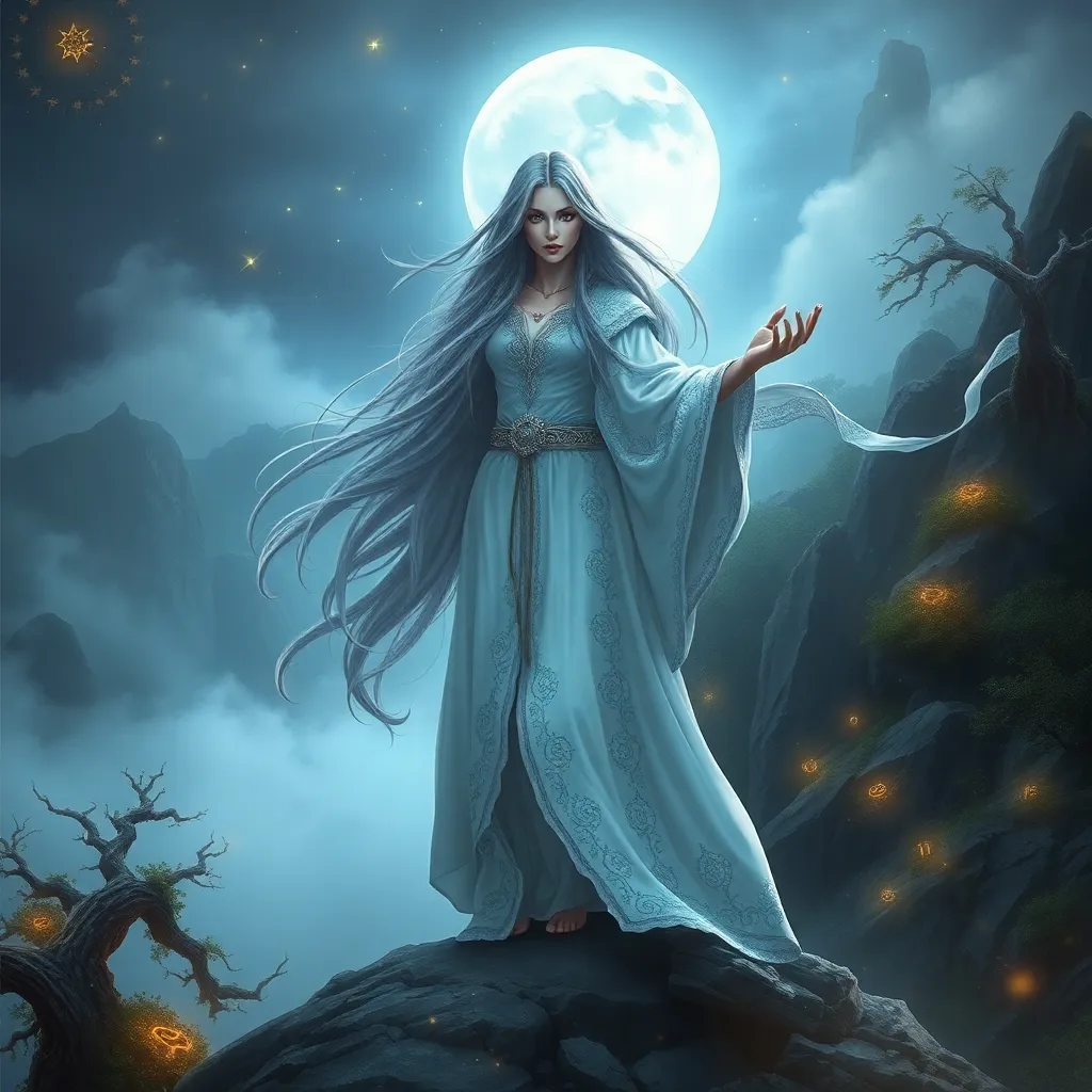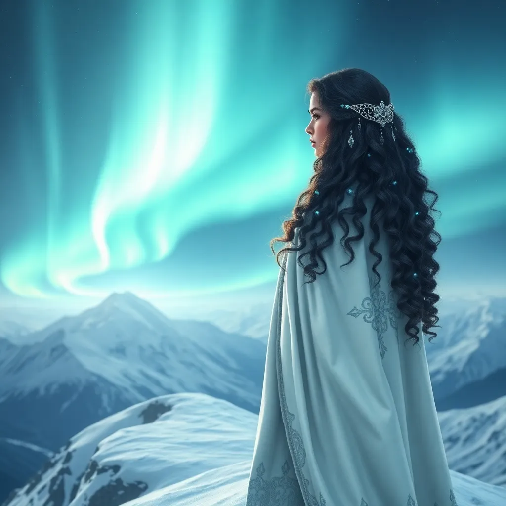 A mystical warrior, 'Aurora', stands atop a snowy mountain peak, gazing out at a radiant aurora borealis. Her long, curly hair is adorned with tiny, shimmering gemstones. She wears a flowing white cloak with intricate, swirling patterns. Her eyes burn with an inner light, as if channeling the celestial magic.