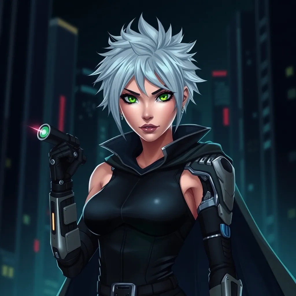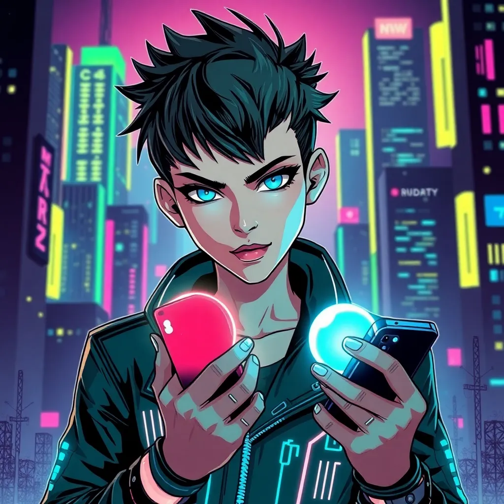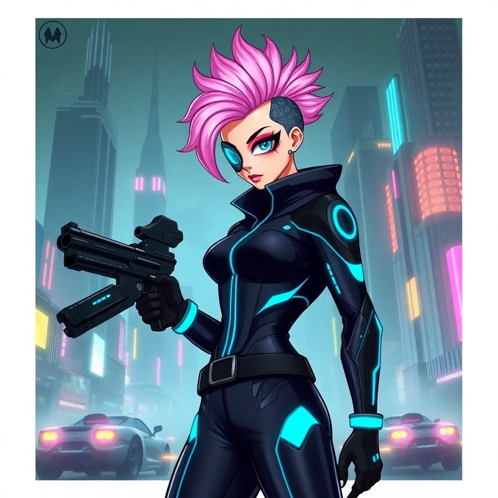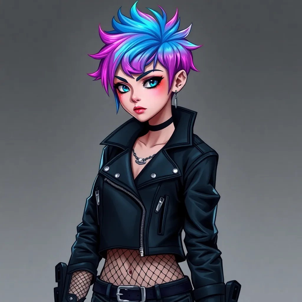Create a futuristic cyberpunk character with a rebellious spirit. Design a young woman with short, spiky hair dyed in neon pink and blue hues. She wears a black leather jacket with metallic accents, ripped fishnet stockings, and combat boots. Give her a determined expression and a hint of mischief in her eyes.