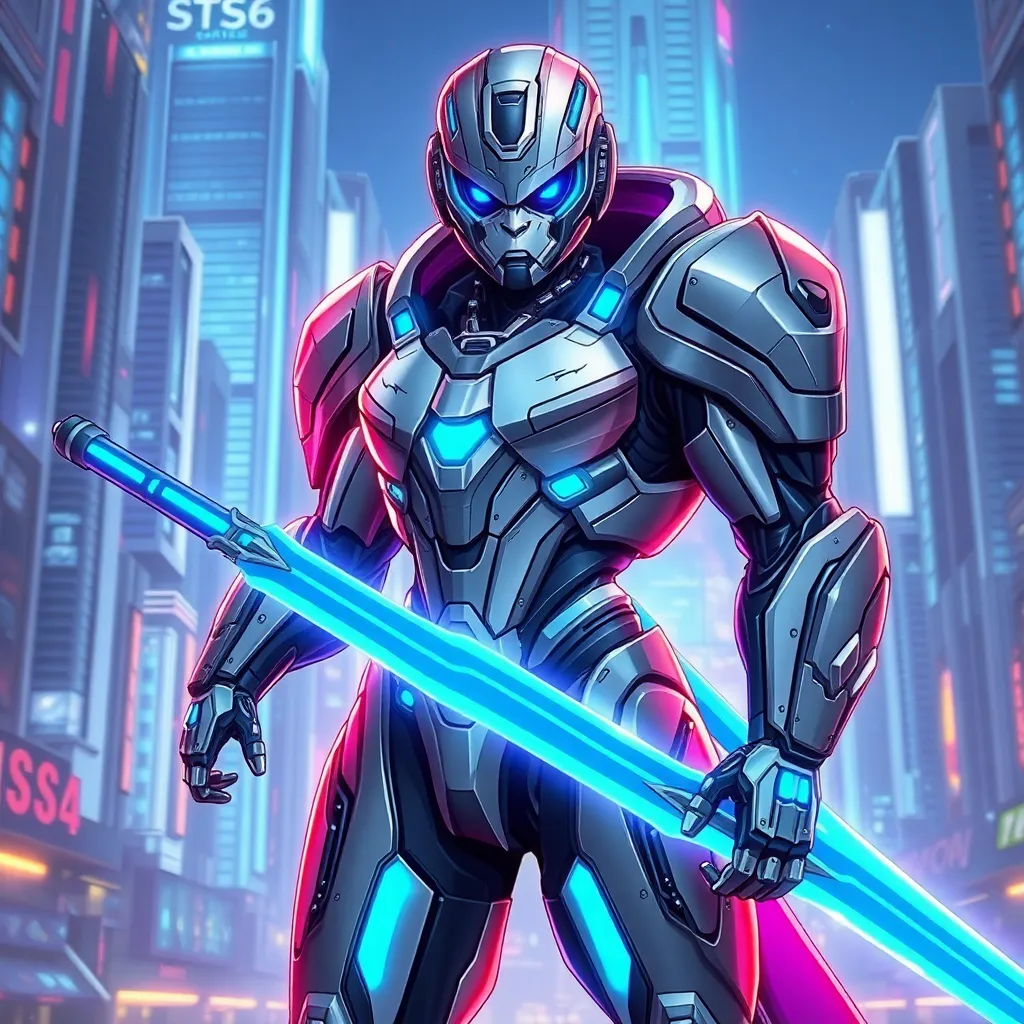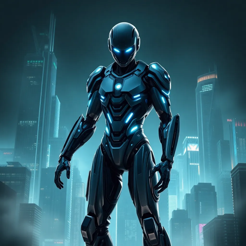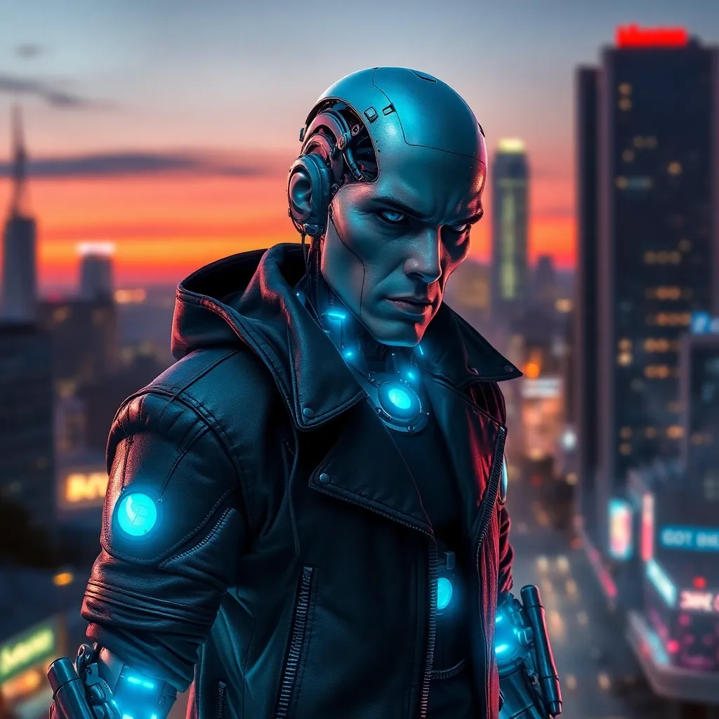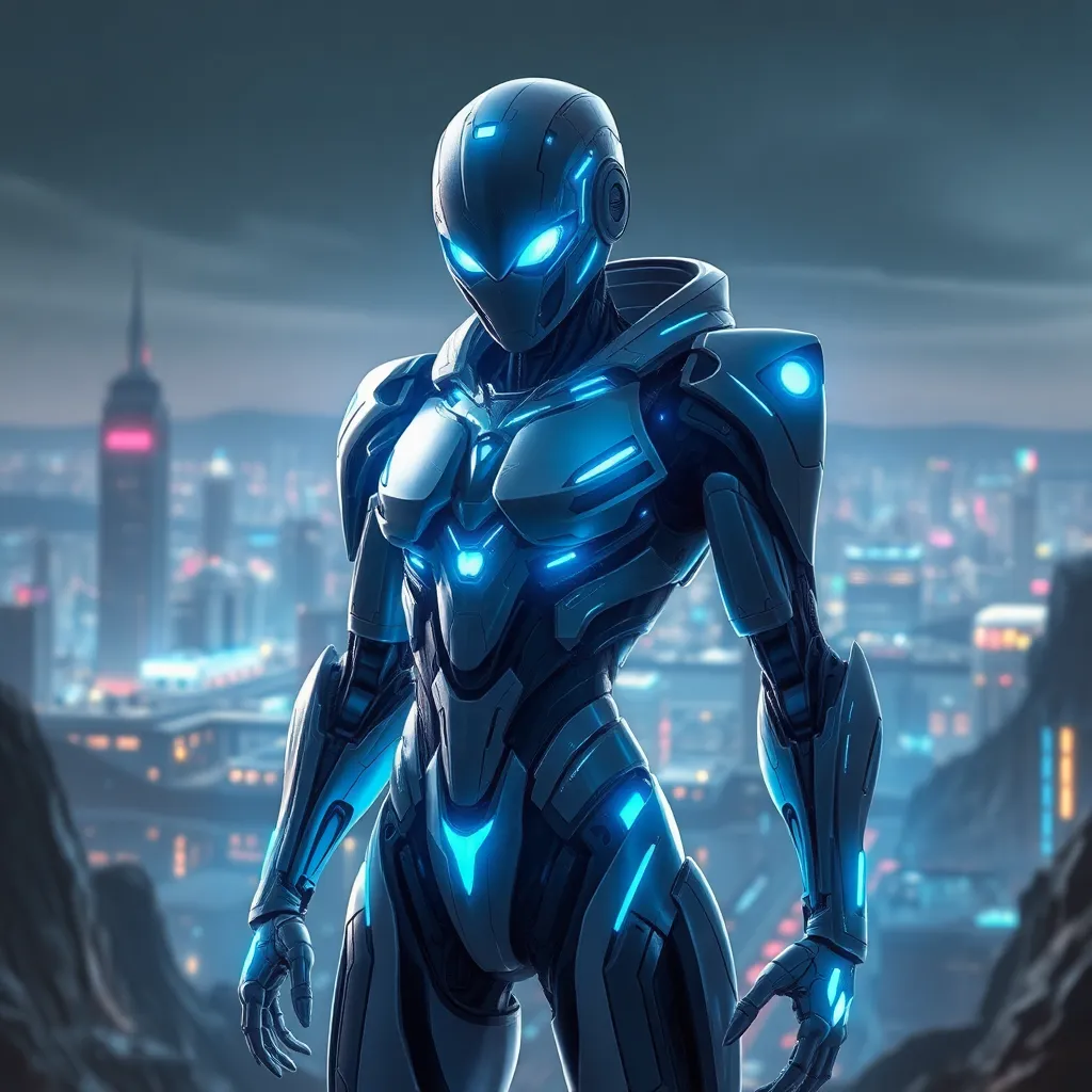 Create a futuristic cyborg with glowing blue eyes, metallic limbs, and a sleek, aerodynamic body. The cyborg should have a mysterious, otherworldly aura and be posed in a dramatic, heroic stance, with a cityscape or futuristic landscape in the background. Incorporate neon lights and holographic details.