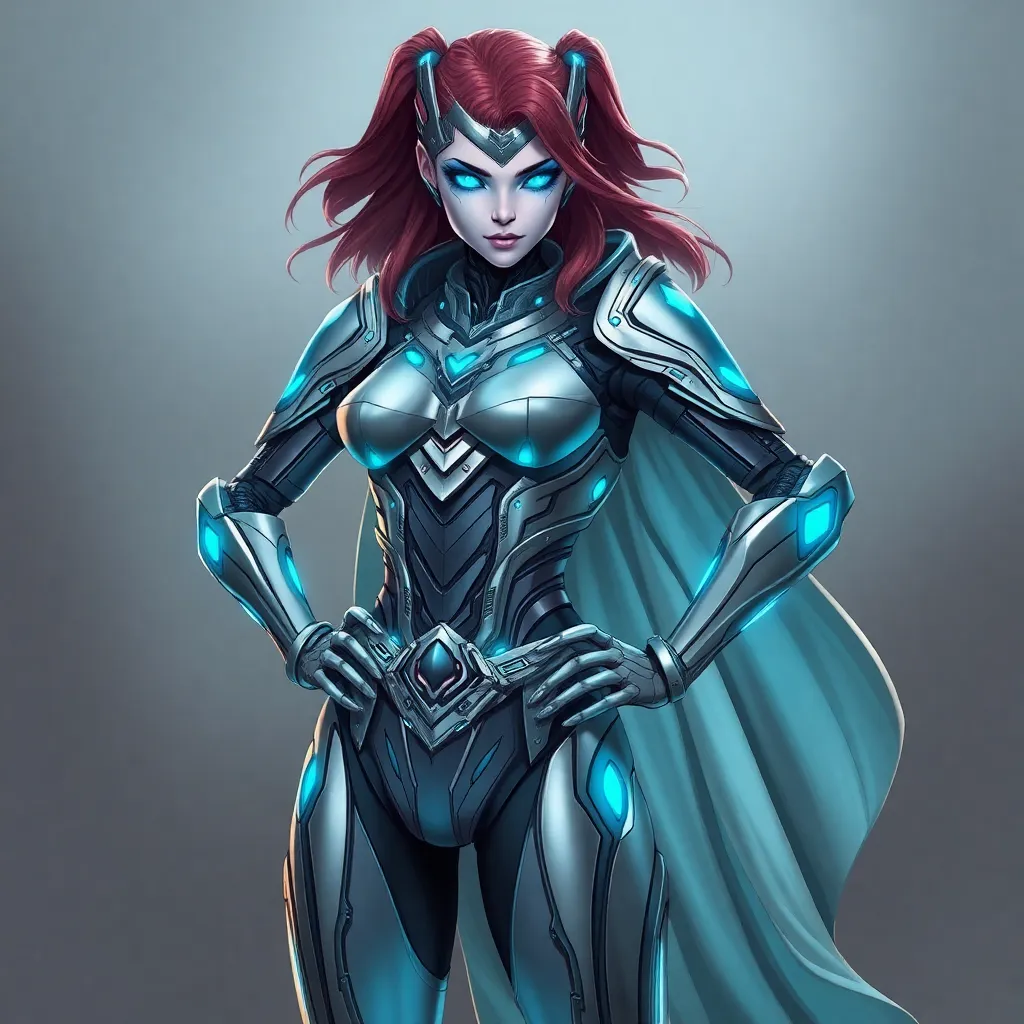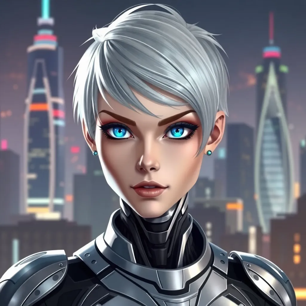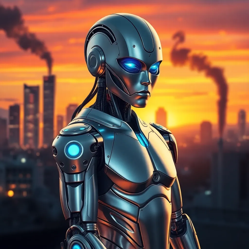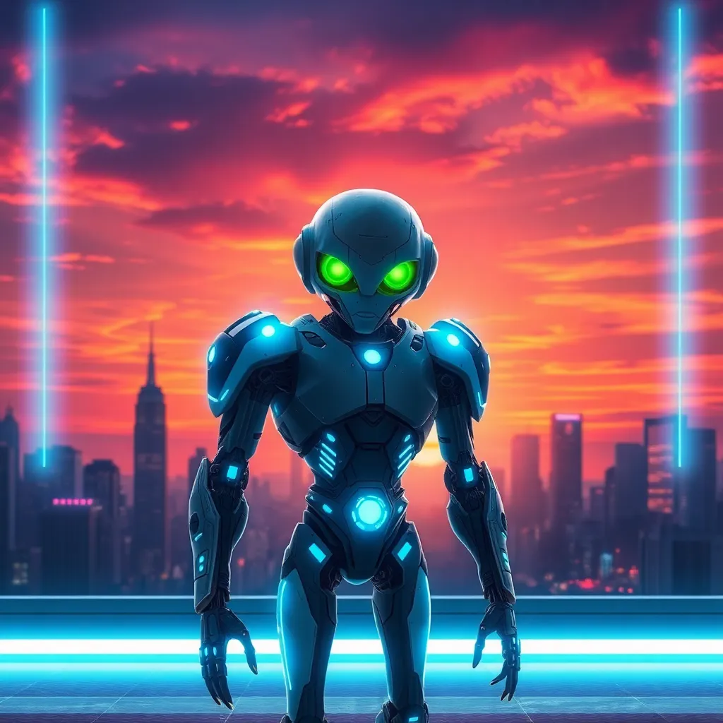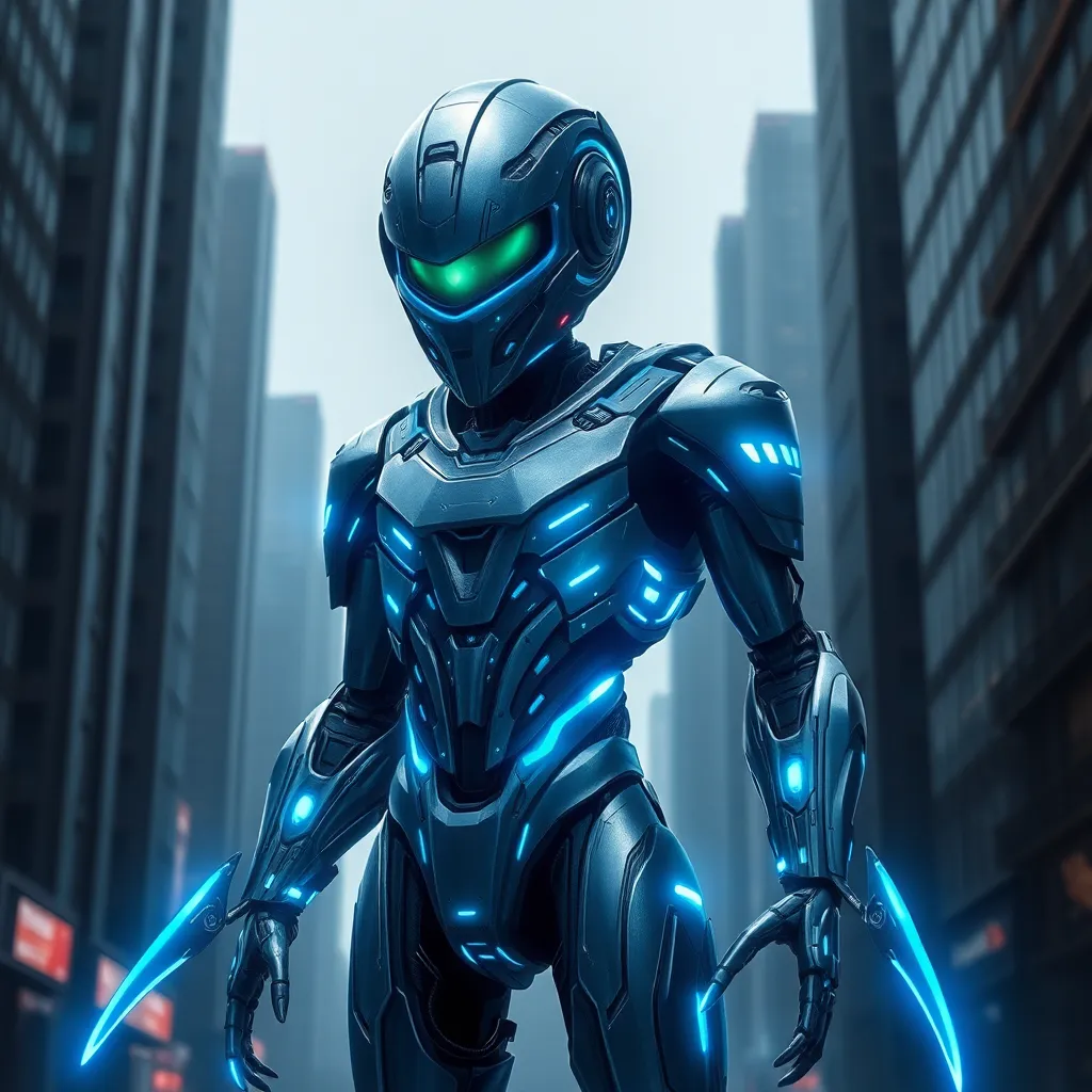 Create a futuristic cyborg with glowing blue eyes, metallic limbs, and a sleek, aerodynamic body. The cyborg should have a mysterious, otherworldly aura and be posed in a dramatic, heroic stance, with a cityscape or futuristic landscape in the background. Incorporate neon lights and holographic details.