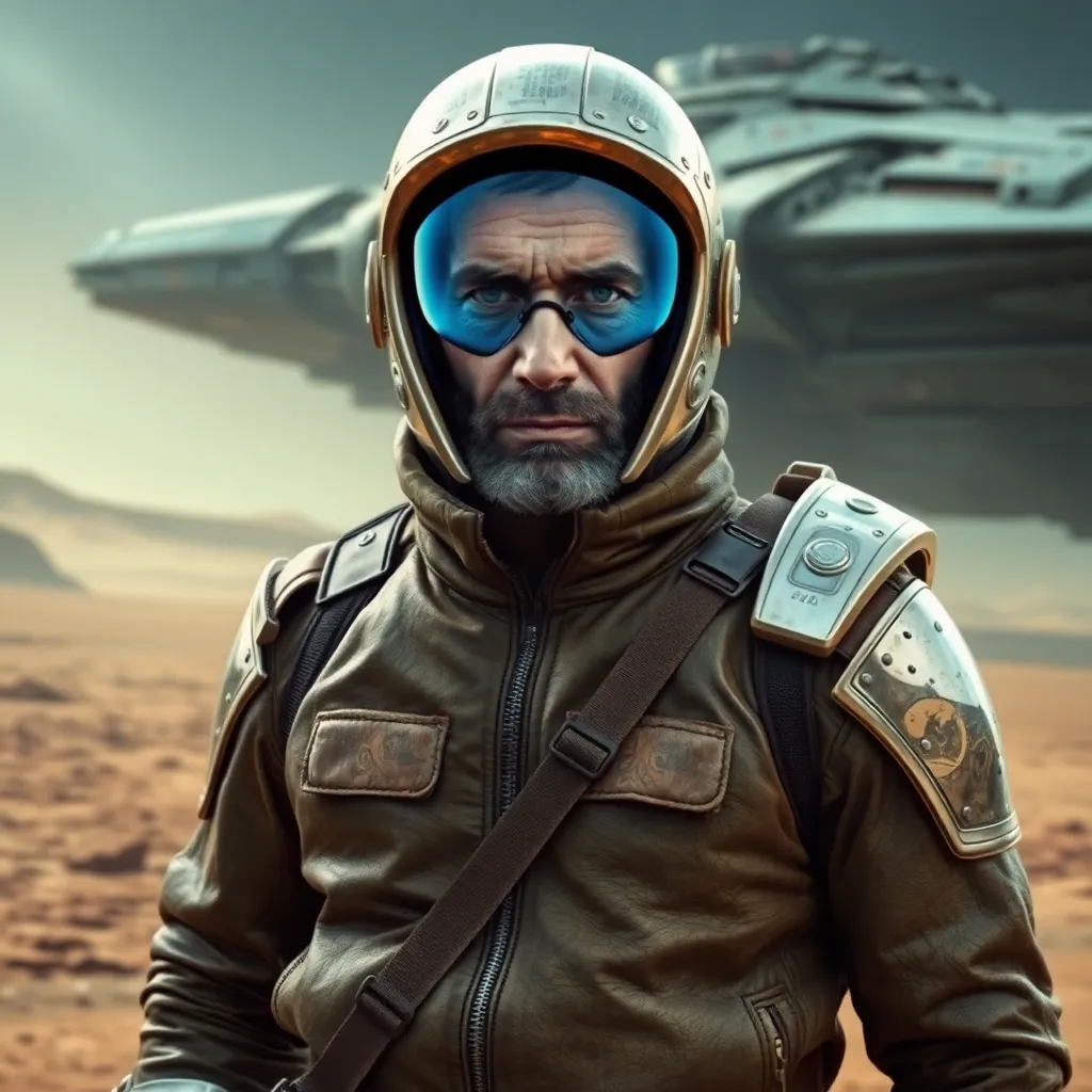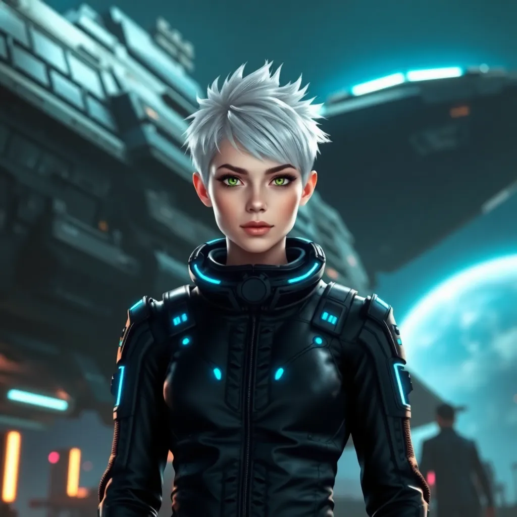 Create a futuristic space explorer, dressed in a sleek black jumpsuit with glowing blue accents. They have short, spiky silver hair and piercing green eyes. They're standing in front of a massive spaceship, with a planet in the background. The atmosphere is dark and gritty, with neon lights illuminating the scene.