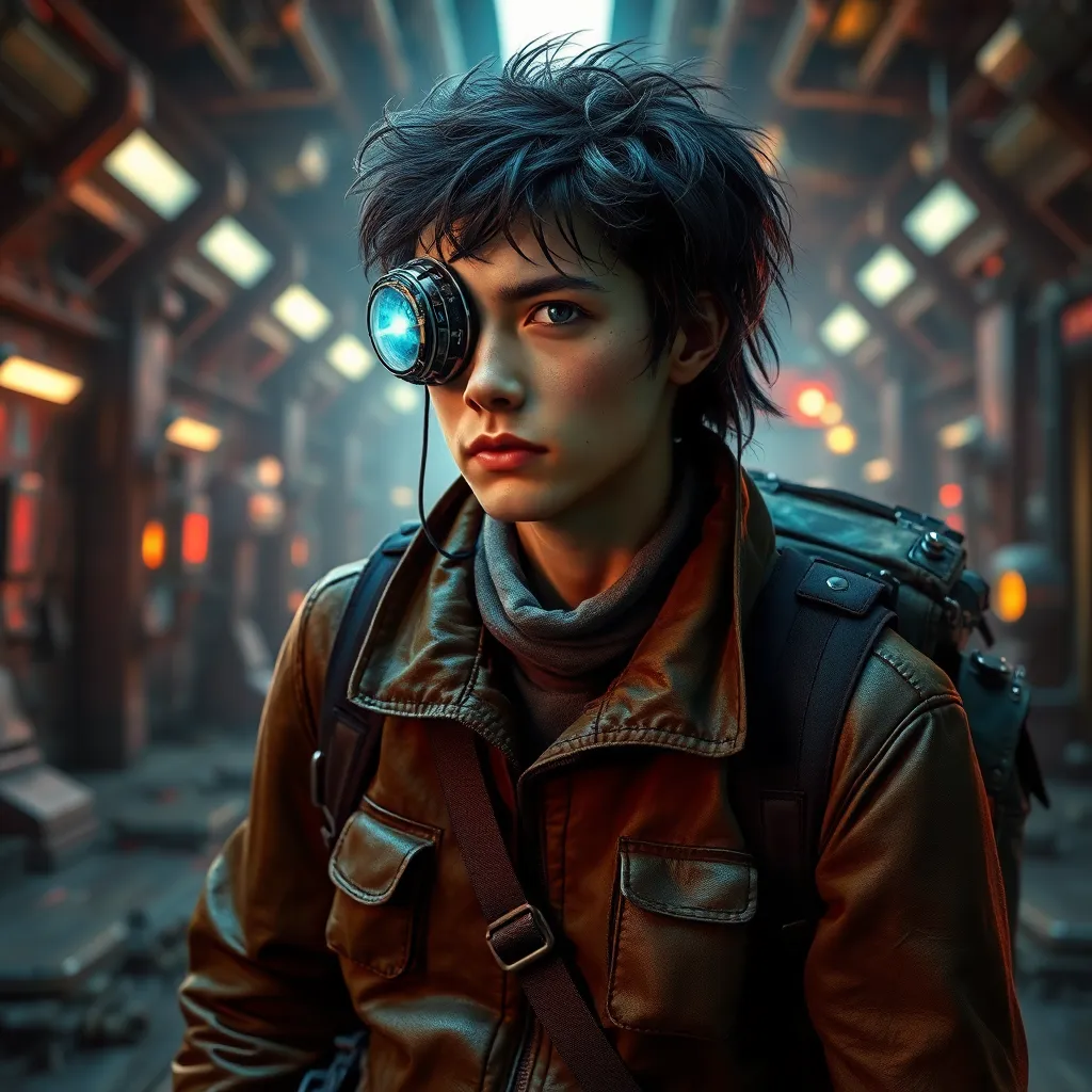 Create a futuristic space explorer with a cybernetic eye, wearing a worn leather jacket and carrying a worn-out backpack. The explorer should have a determined expression and a hint of exhaustion. Set against a dimly lit, gritty space station background with flickering neon lights and old machinery in the distance.