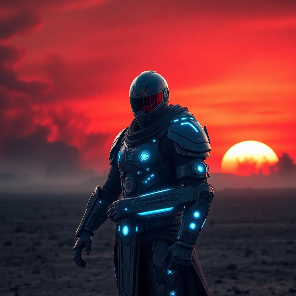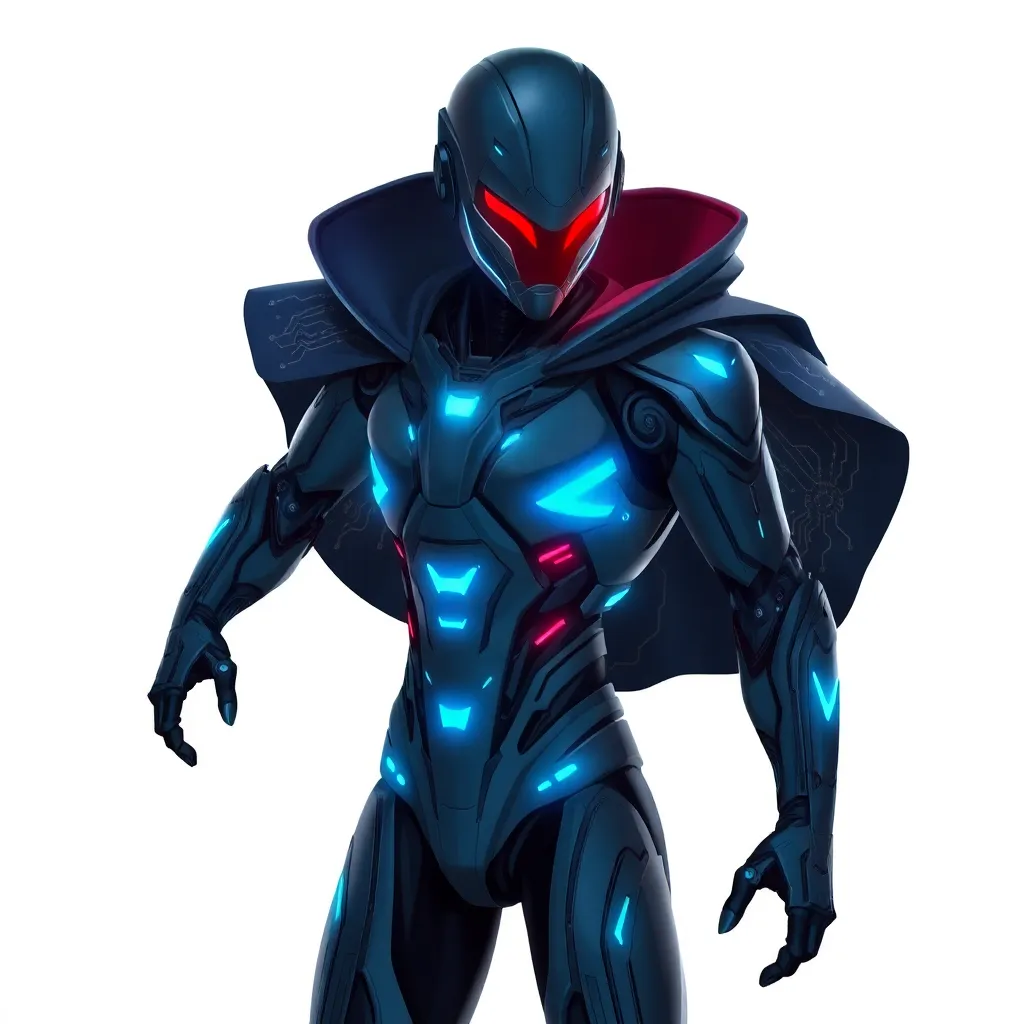 Create a futuristic cyborg with glowing blue circuits and a metallic exoskeleton. The cyborg should have a striking red LED eye and a sleek, aerodynamic design. Incorporate a flowing cape with intricate circuitry patterns and a dynamic pose that conveys strength and agility. Generate an image that exudes high-tech power.