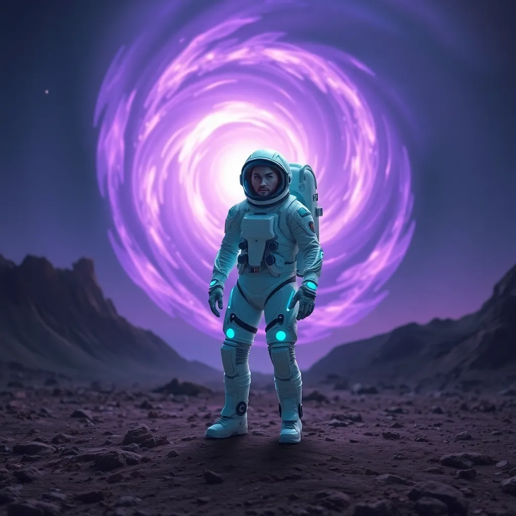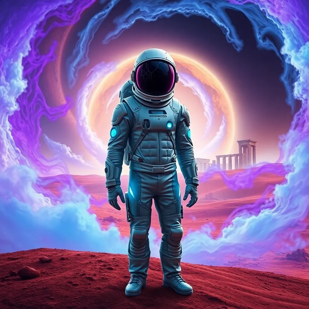 Create a futuristic astronaut standing on a distant planet, surrounded by a swirling vortex of purple and blue gases. The astronaut wears a sleek, silver spacesuit adorned with glowing blue accents and a helmet with a cracked visor. The planet's rusty red terrain stretches out behind, with ancient ruins in the distance.
