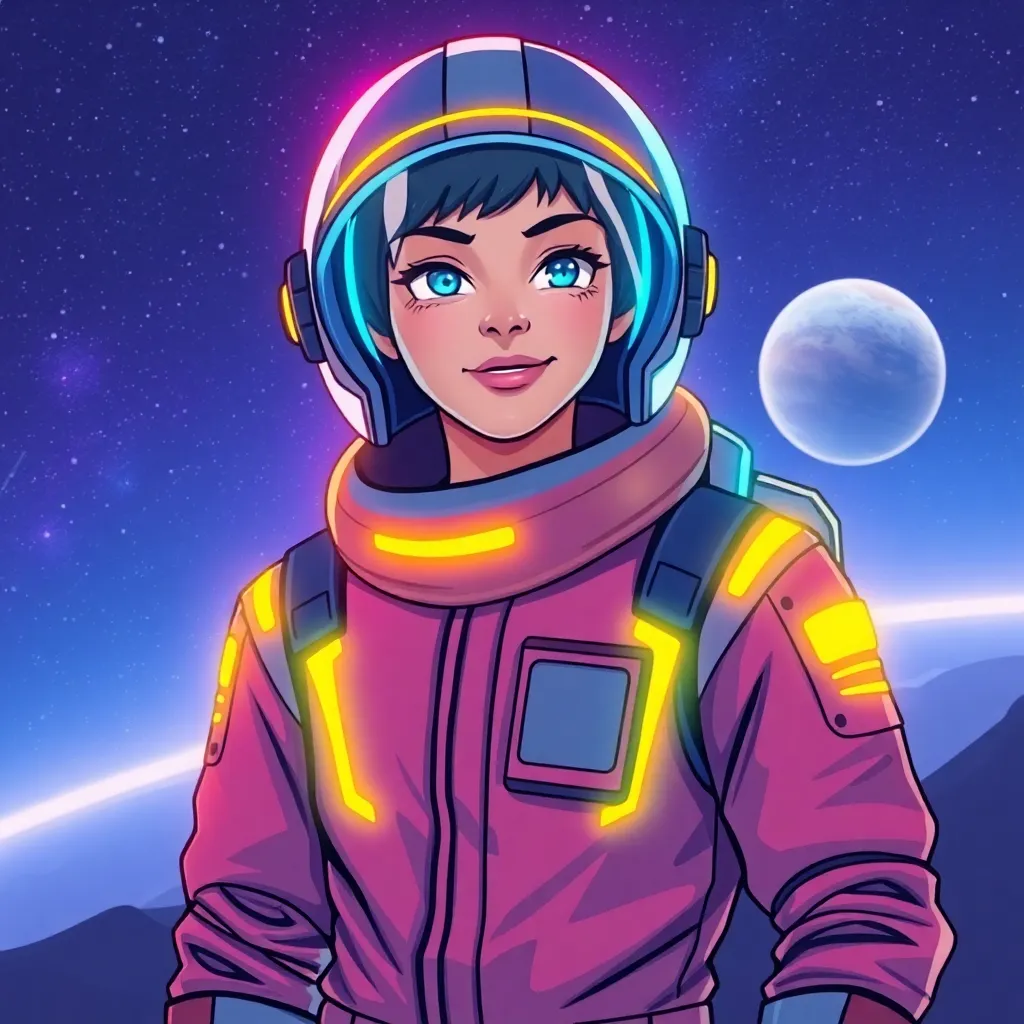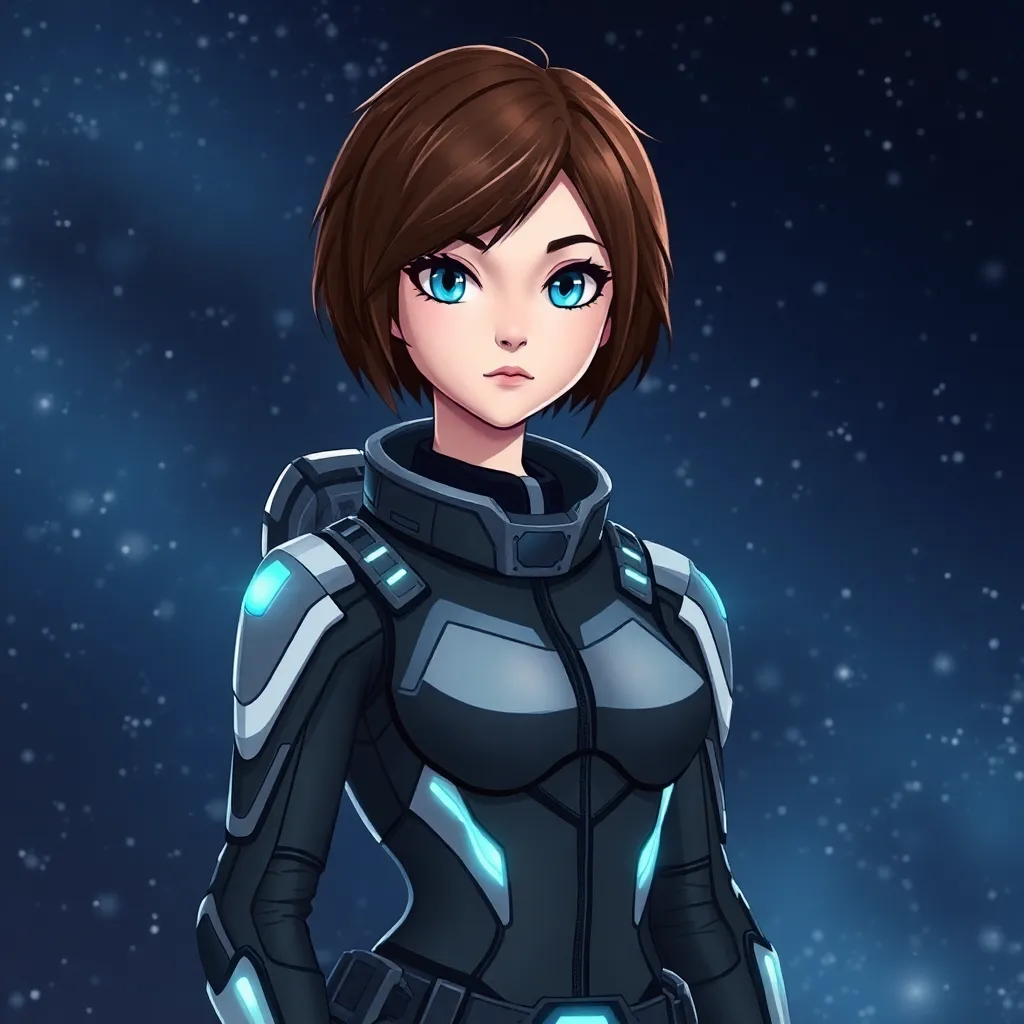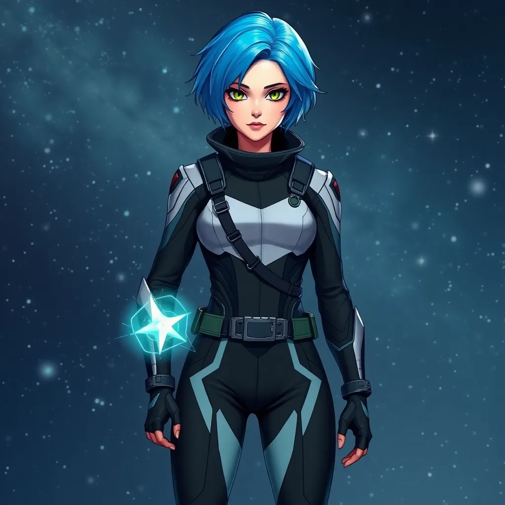 Create a futuristic space explorer, 'Astra', with a slender build, short blue hair, and piercing green eyes. She wears a sleek black and silver jumpsuit with a utility belt and has a holographic display projected on her wrist. She stands confidently in front of a starry galaxy background, ready for adventure.