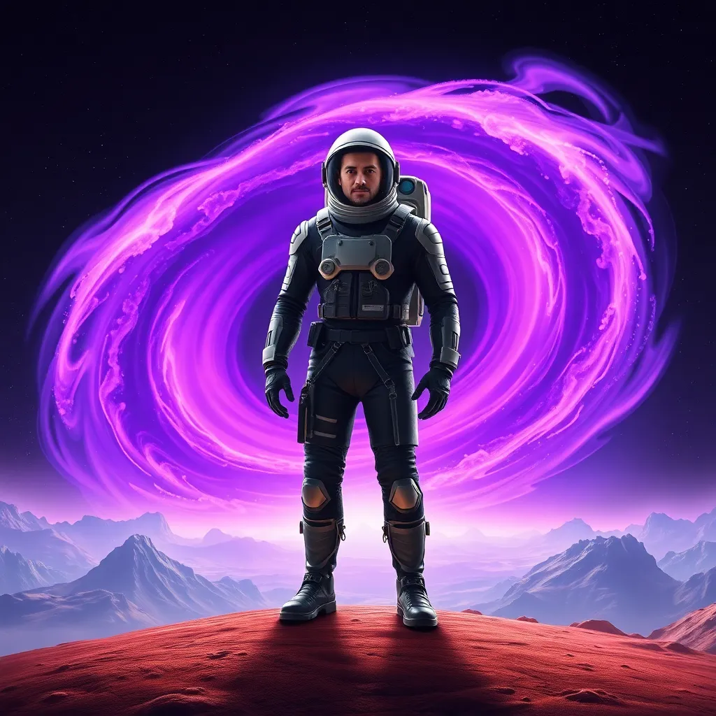 Create a futuristic astronaut standing on a distant planet's surface, surrounded by a swirling vortex of purple gas. The astronaut is dressed in a sleek black and silver spacesuit, with a confident expression and a utility belt around their waist. The planet's landscape stretches out into the distance, with towering mountains and deep valleys.