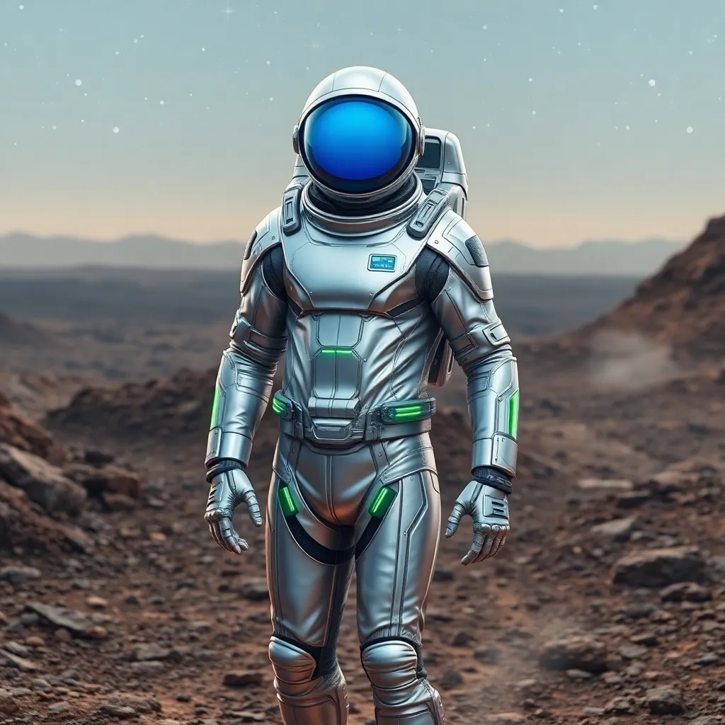 Create a futuristic astronaut with a sleek, silver spacesuit and a glowing blue visor. They should be standing on a rocky, alien planet with a distant starry sky. Incorporate subtle, neon-green accents on the suit and add a hint of misty fog rising from the ground. Make the astronaut look confident and strong.