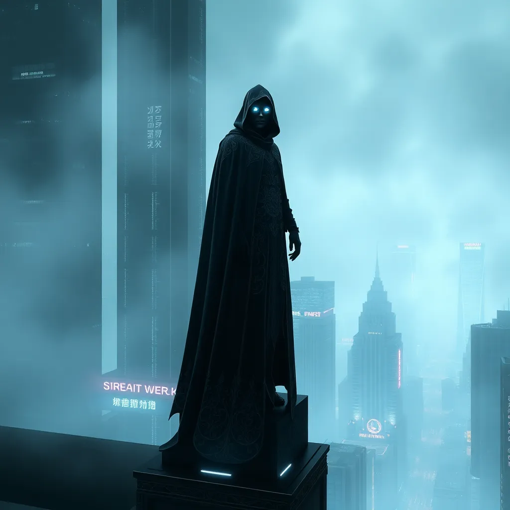 Create a futuristic cityscape with a mysterious figure standing atop a skyscraper. The figure is dressed in a long, flowing cloak with intricate patterns, and has glowing blue eyes. The city is shrouded in a thick fog, with neon lights reflecting off the wet pavement. Generate an image with a sense of eeriness and otherworldliness.