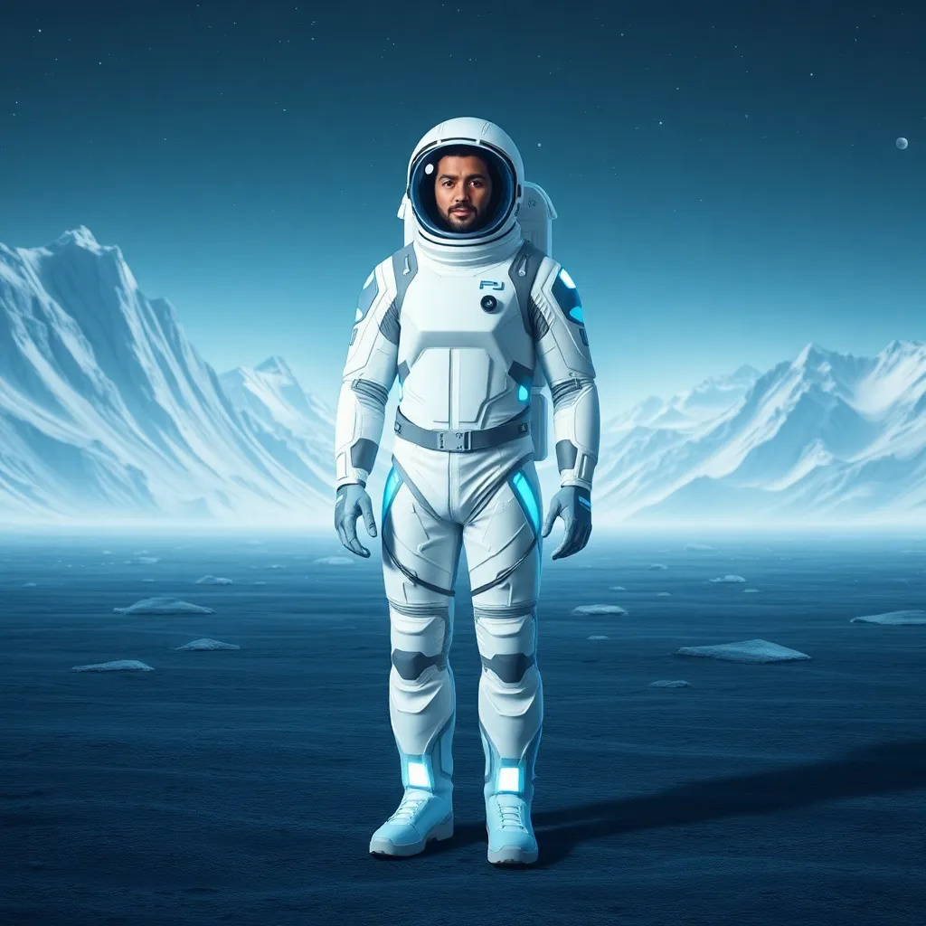 Create a futuristic astronaut standing on the surface of a distant, icy planet. The astronaut wears a sleek white spacesuit with glowing blue accents and has a confident expression. The planet's landscape features towering glaciers, snow-capped mountains, and a vast, starry sky. The astronaut's suit should glow with an soft blue light.