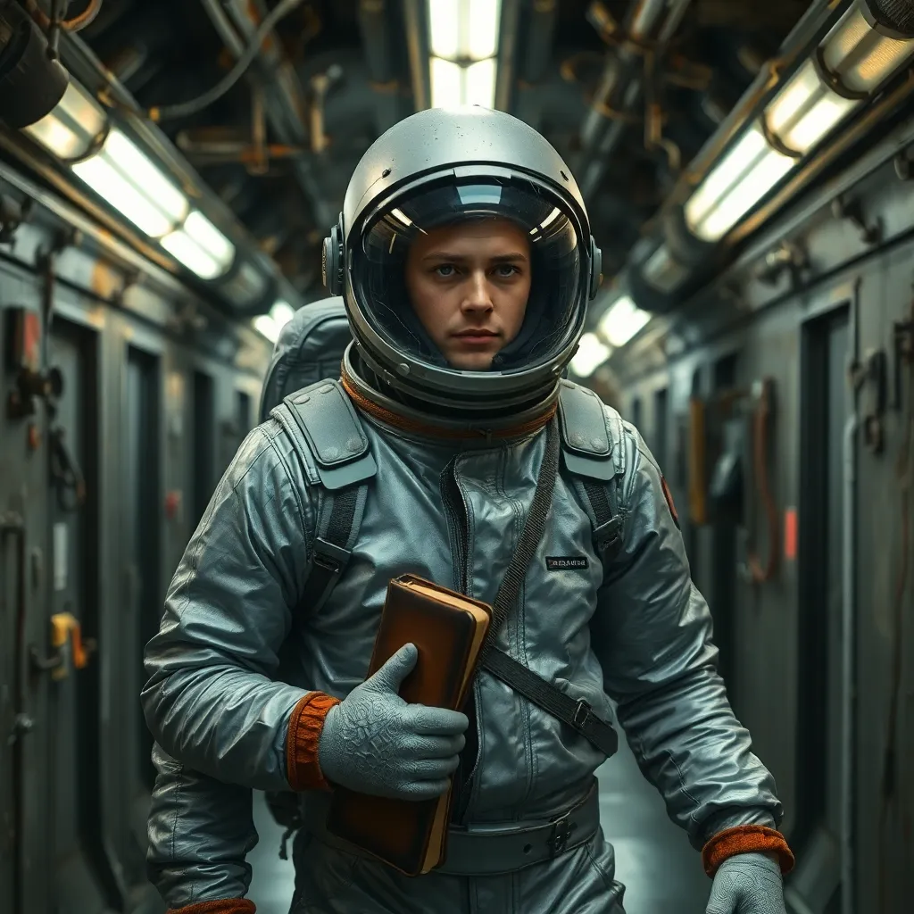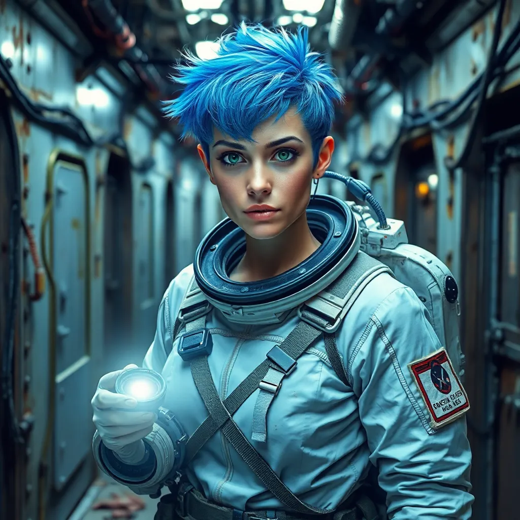 Create a futuristic astronaut exploring a mysterious, abandoned space station. The astronaut is a 30-year-old woman with short, spiky blue hair and piercing green eyes. She wears a worn, white spacesuit with a utility belt and carries a flashlight. The background is a dimly lit, rusted corridor with wires and debris.