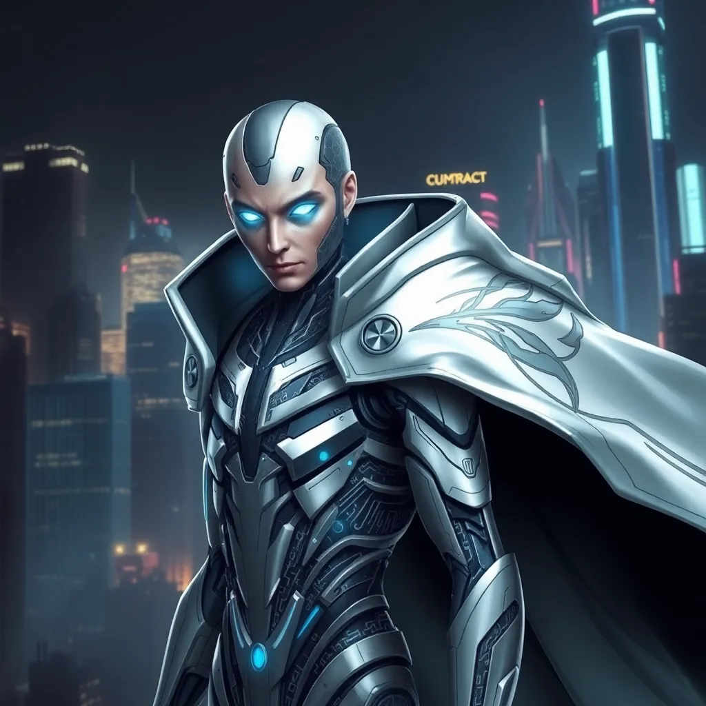 Create a futuristic cyborg with a mix of human and mechanical parts. The cyborg should have glowing blue eyes, metallic skin with a subtle circuitry pattern, and a flowing silver cape with an intricate design. The background should be a dark, gritty cityscape with neon lights and towering skyscrapers.