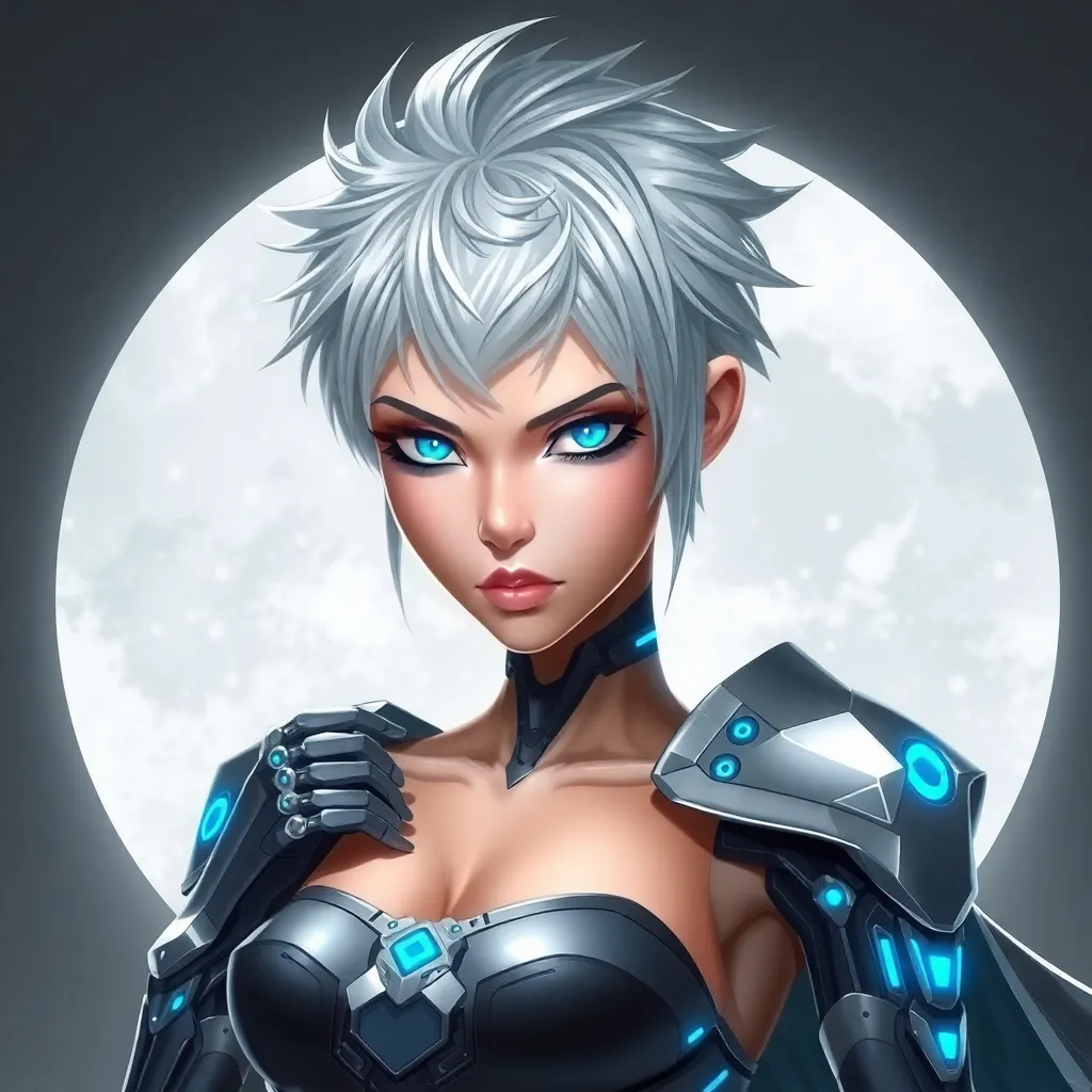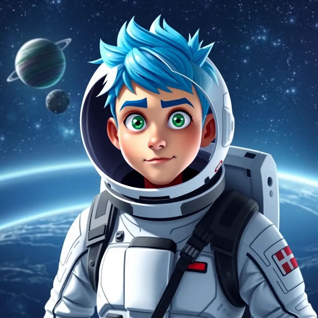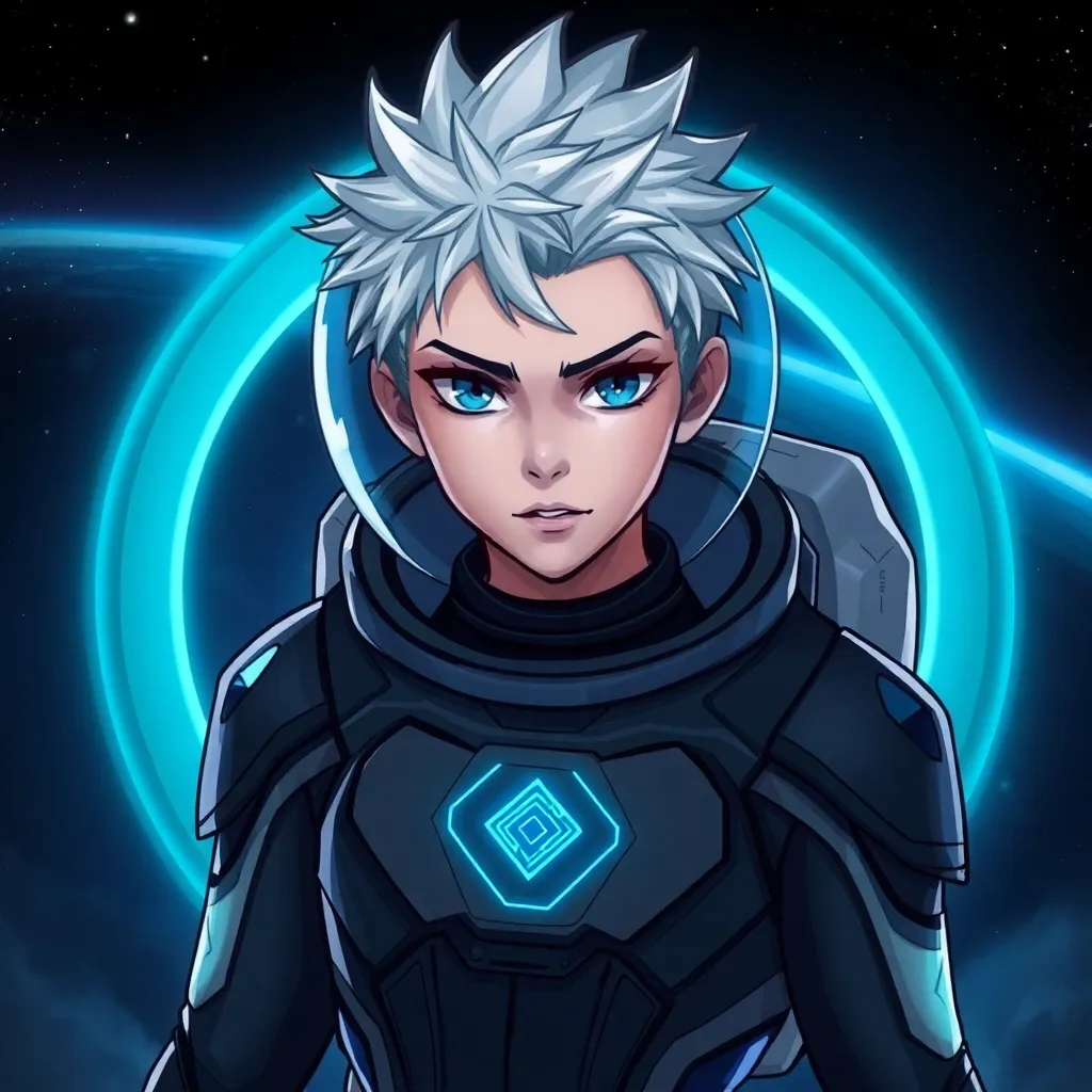 Create a futuristic astronaut with a mysterious aura. The character should have piercing blue eyes, short spiky silver hair, and a lean athletic build. They should be wearing a sleek black spacesuit with a holographic display on the chest. The background should be a dark, starry galaxy with a distant planet in the distance.