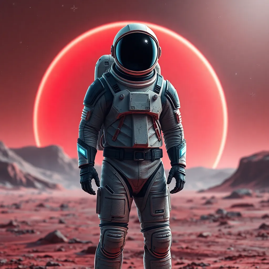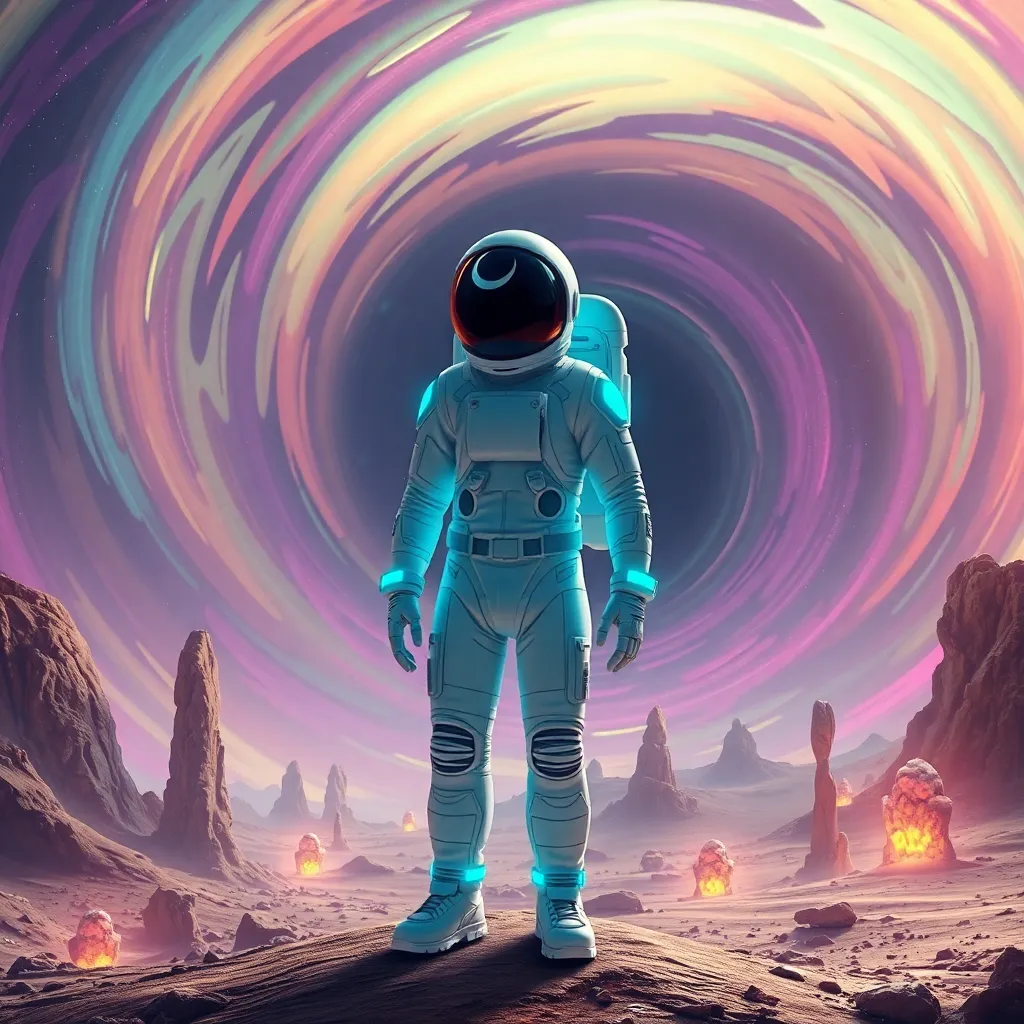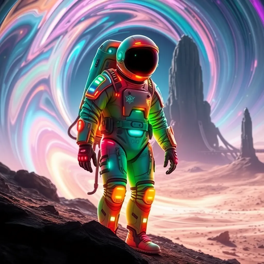 Create a futuristic astronaut standing on a distant planet's surface, surrounded by a swirling vortex of colors and lights. The astronaut's suit is a mesmerizing blend of neon hues, with glowing accents and intricate details. The planet's terrain is rugged and barren, with towering rock formations in the background.