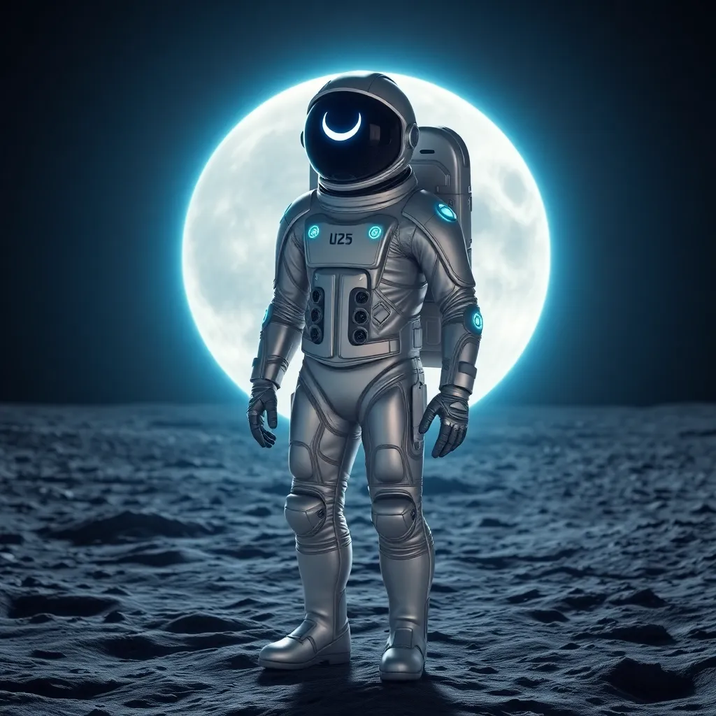 Create a futuristic astronaut standing on a distant planet, surrounded by a swirling vortex of colors. The astronaut wears a sleek white spacesuit with glowing blue accents, and their helmet is adorned with a crescent moon symbol. The planet's landscape is dotted with strange, glowing rock formations.