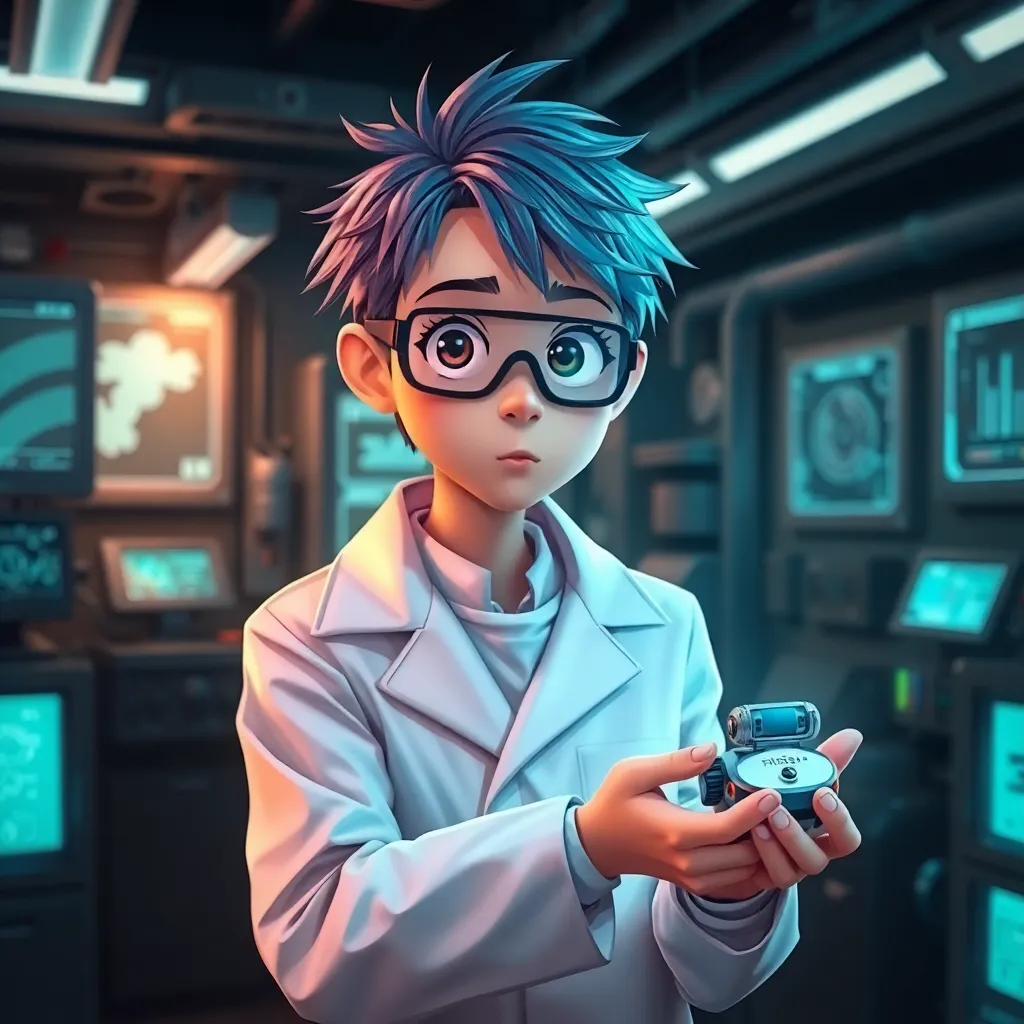 Create a futuristic scientist with a curious expression, wearing a sleek white lab coat and goggles, holding a small robotic device in their hand. The background should be a dimly lit, high-tech laboratory with holographic screens and machinery. The scientist's hair should be short and messy, with a hint of blue undertones.