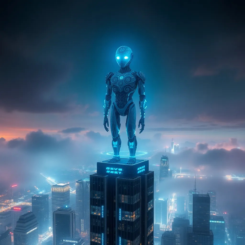 Create a futuristic cityscape with a lone, glowing robot standing atop a skyscraper, surrounded by a haze of neon lights and towering clouds. The robot's eyes glow bright blue, and its body is adorned with intricate, swirling patterns. The city below is bustling with activity, but the robot remains still.