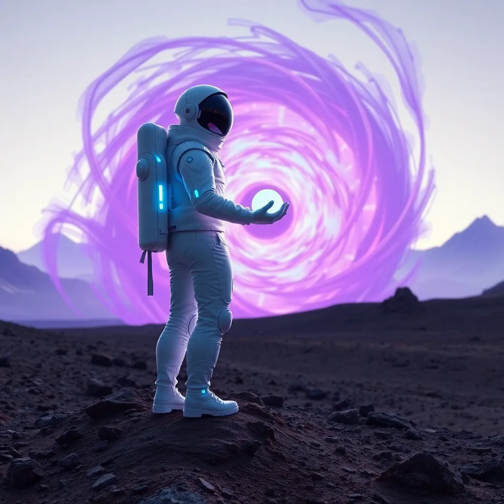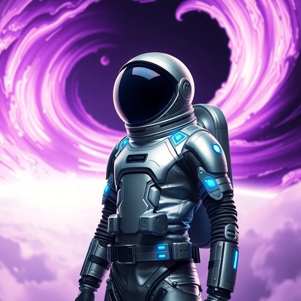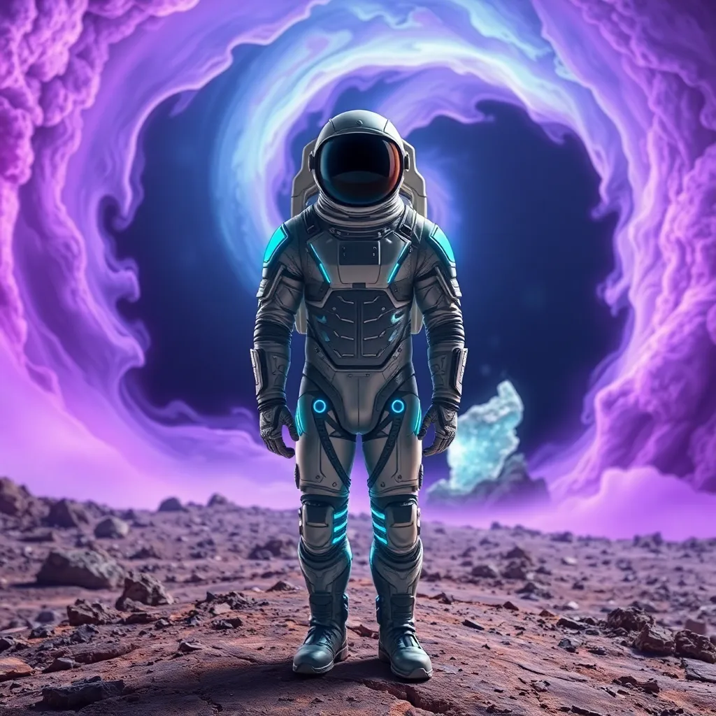 Create a futuristic astronaut standing on a distant planet, surrounded by a swirling vortex of purple and blue gases. The astronaut wears a sleek silver suit with glowing blue accents and a helmet with a tinted visor. The planet's rocky terrain stretches out behind them, with a strange, glowing crystal formation in the distance.