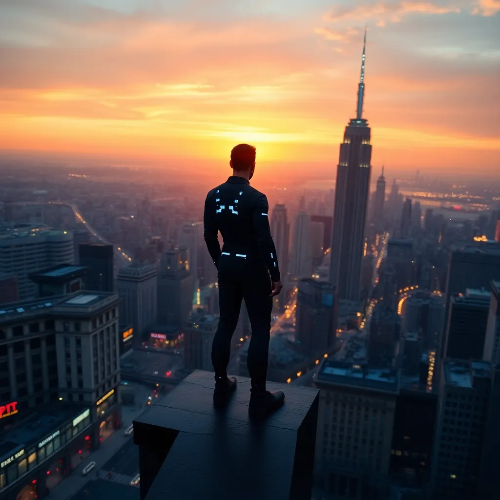 Create a futuristic cityscape at sunset, featuring a lone figure standing atop a skyscraper. The figure is dressed in a sleek black jumpsuit, with glowing blue circuits visible beneath the fabric. The city is a mix of ancient and modern architecture, with neon lights reflecting off the wet pavement.