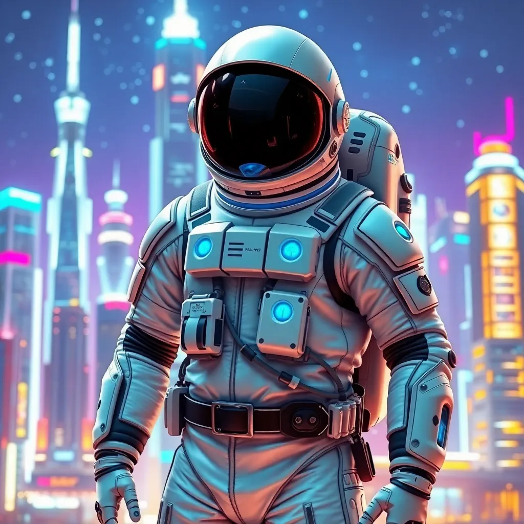 Create a futuristic astronaut wearing a sleek white spacesuit with a silver helmet and glowing blue accents. The suit should have a utility belt with a variety of tools and gadgets. The astronaut should be standing in front of a vibrant, neon-lit cityscape with towering skyscrapers and a bright, starry night sky.