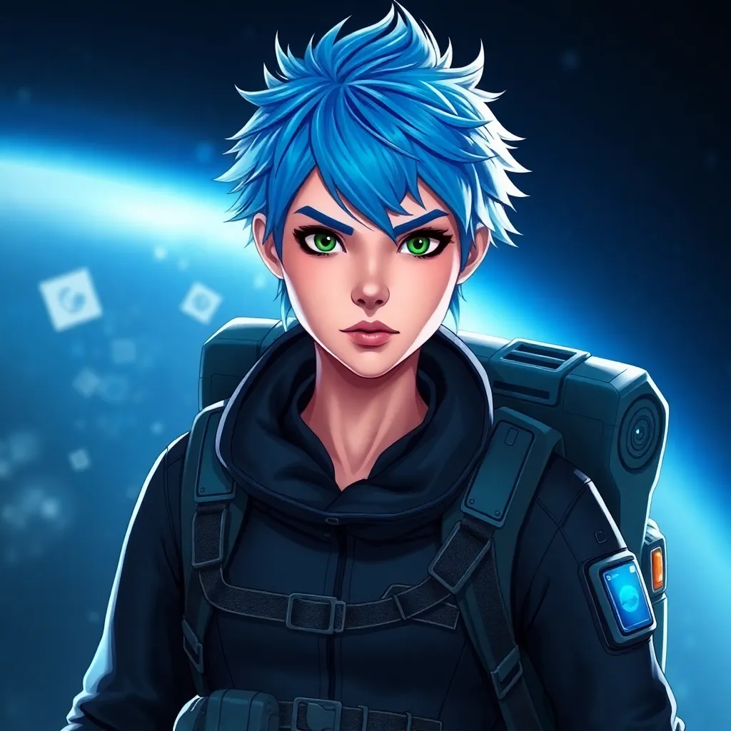 Create a futuristic space explorer, a skilled astrobiologist, with short, spiky blue hair, piercing green eyes, and a determined expression. She wears a sleek black jumpsuit with built-in utility belt and a backpack full of scientific equipment. Generate an image that captures her adventurous spirit and sense of discovery.