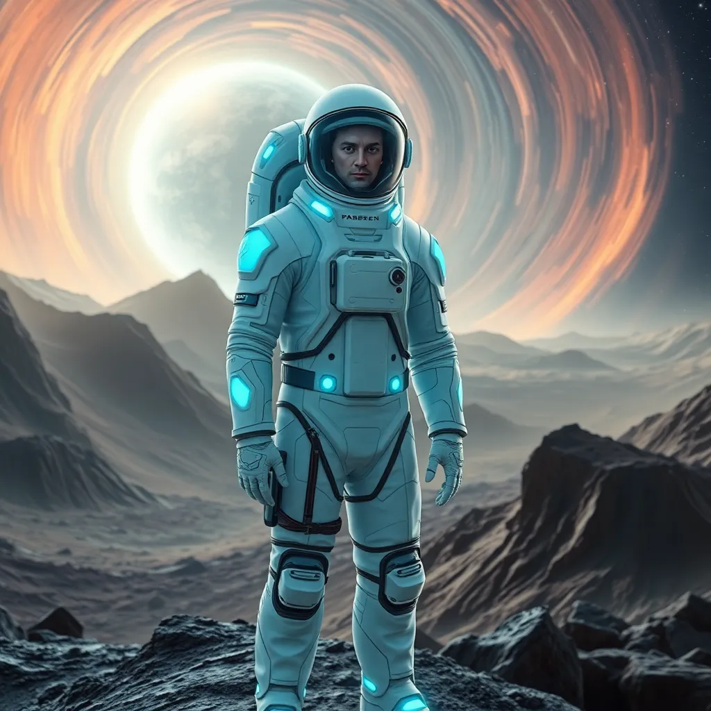 Create a futuristic astronaut standing on a distant planet, surrounded by a swirling vortex of colors. The astronaut wears a sleek white spacesuit adorned with glowing blue accents, and has a determined expression on their face. The planet's rugged terrain stretches out behind them, with a distant spaceship in the sky.