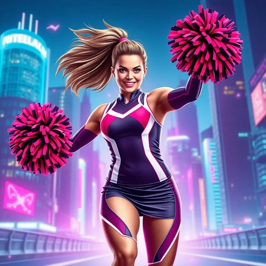 Create an image of a dynamic adult cheerleader in a sleek, high-tech uniform, surrounded by a futuristic cityscape. She's mid-pom-pom swing, with a fierce expression and a burst of energy. Incorporate neon lights, bold graphics, and a touch of whimsy to capture the essence of a modern-day cheerleading superhero.