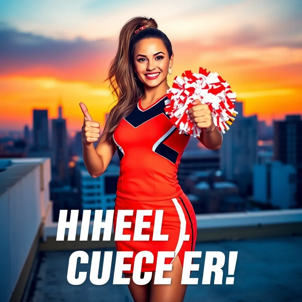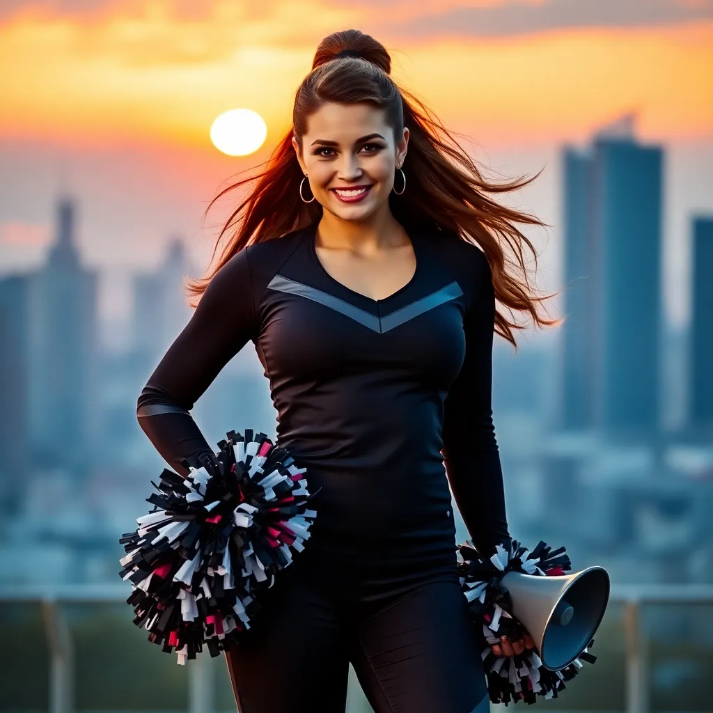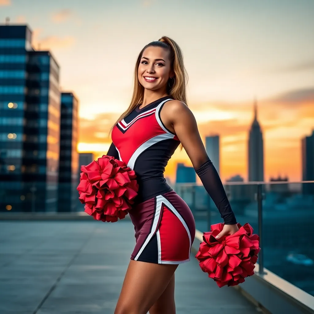 Create an image of a dynamic, professional cheerleader, dressed in a sleek uniform and pom-poms, posing confidently on a city rooftop at sunset. Incorporate a bold, cityscape backdrop and a hint of movement, as if she's about to leap into a spectacular stunt. Exude energy, enthusiasm, and empowerment.