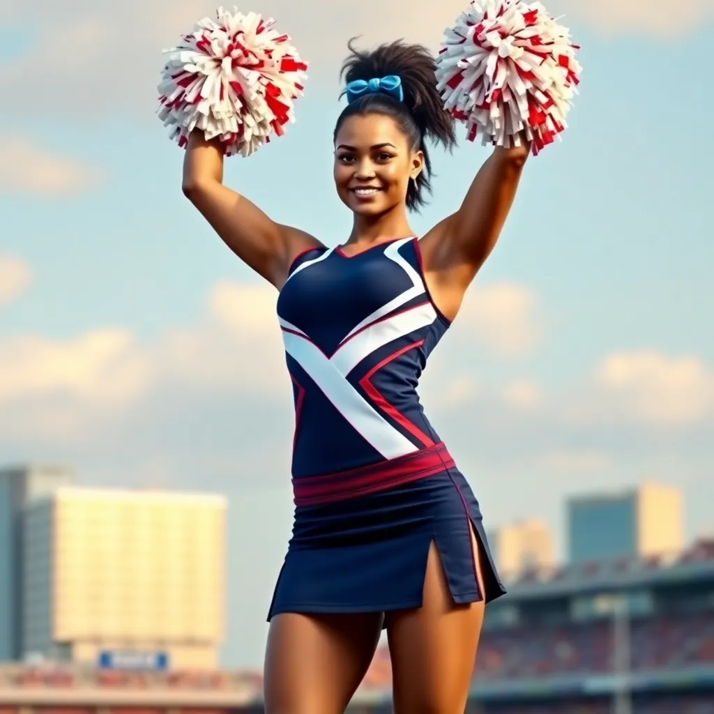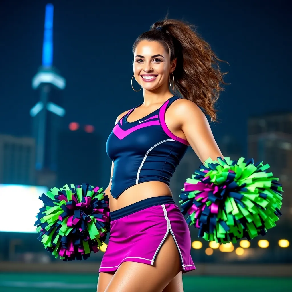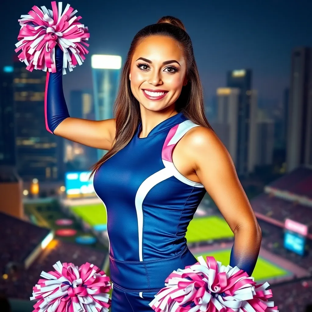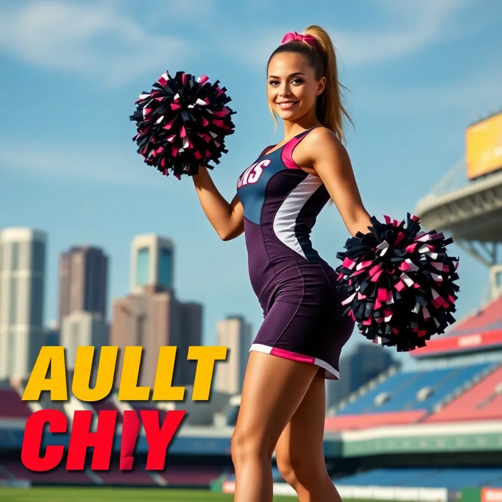 Create an image of a dynamic adult cheerleader in a sleek, modern uniform, posing confidently with pom-poms in hand. Incorporate a cityscape or sports stadium background to convey energy and excitement. The cheerleader should exude a sense of empowerment, determination, and joy, with a bright smile and sparkling eyes.