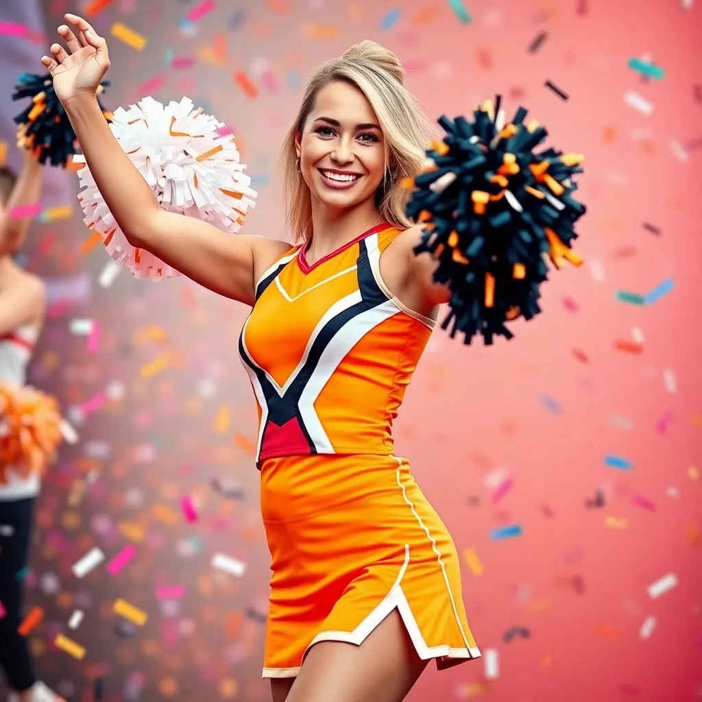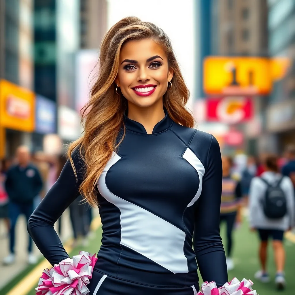 Create an AI image of a confident and energetic adult cheerleader in a sleek, modern uniform, surrounded by pom-poms and a vibrant cityscape. Incorporate a bold, dynamic pose and a radiant smile, conveying enthusiasm and excitement for the sport. The image should exude a sense of empowerment and fun.