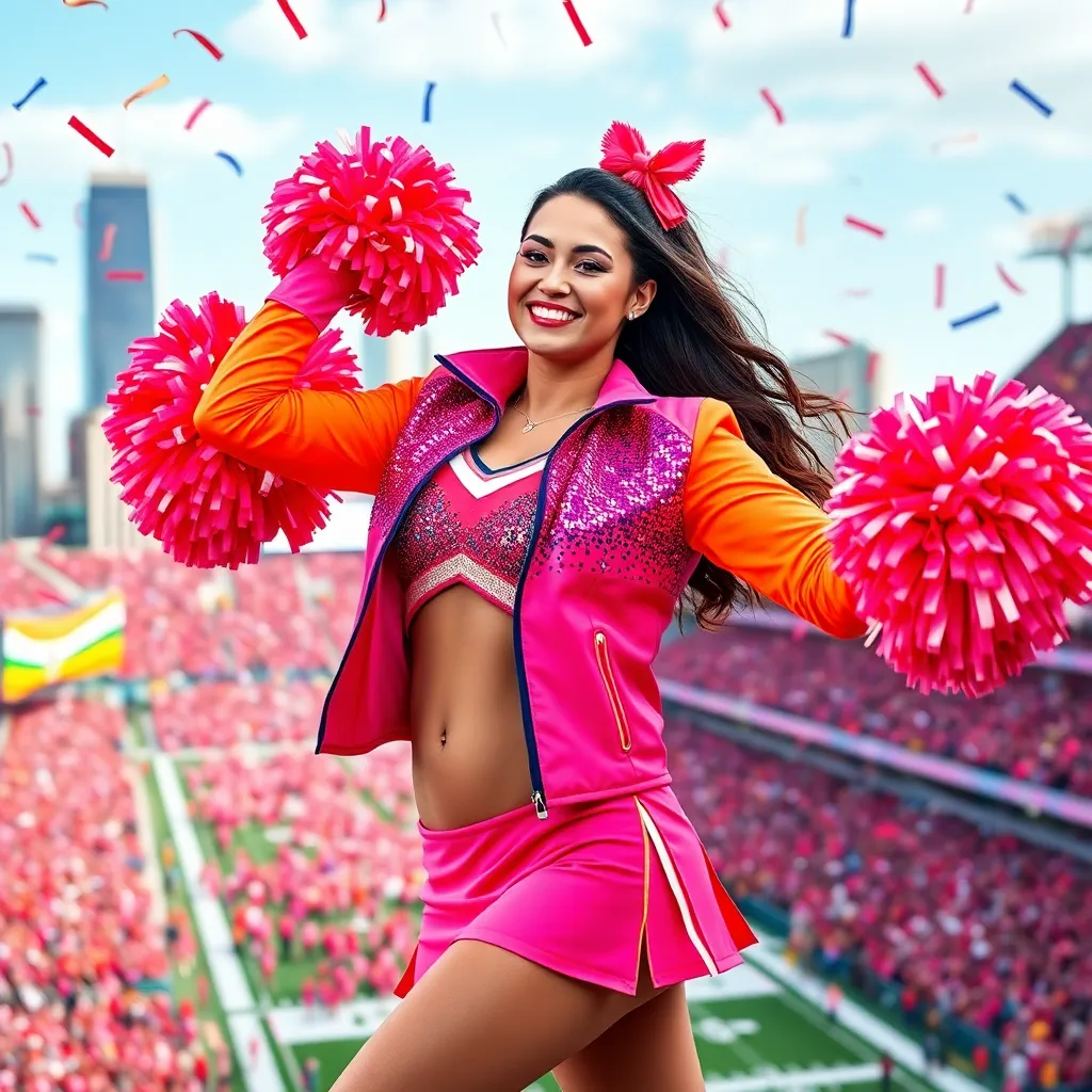 Create a vibrant image of a professional cheerleader in a dynamic pose, wearing a bold, bright uniform with a sequined jacket and matching pom-poms. Set against a city skyline or a bustling sports stadium, she's surrounded by confetti and cheering crowds, radiating energy and enthusiasm for the big game.